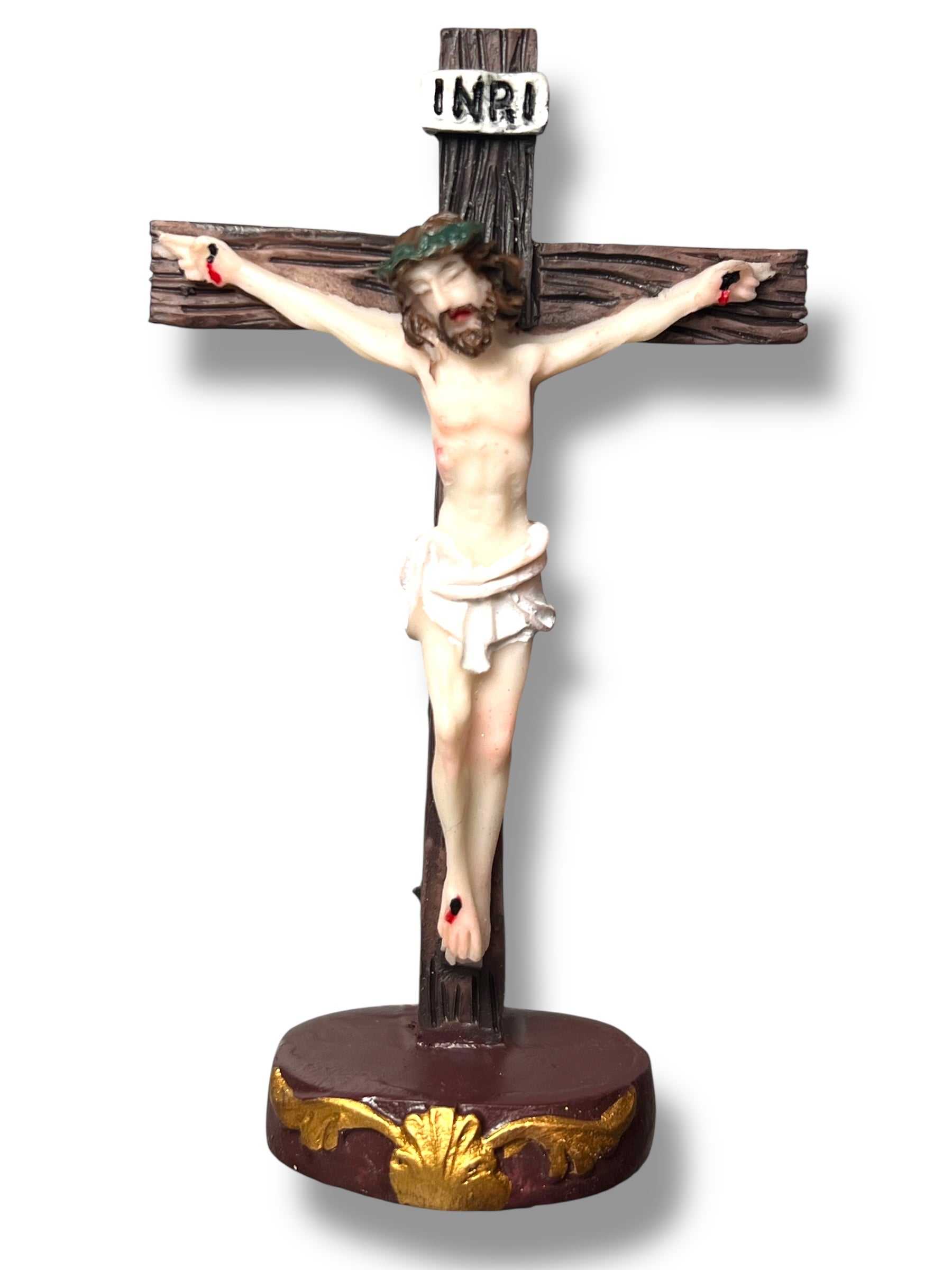 This elegant 3-inch resin standing crucifix seamlessly blends tradition with a dynamic presence in your environment. This small figurine piece offers a meaningful expression of faith and individuality, enhancing both home and office settings. Its modest size belies its impactful nature, radiating hope and serenity. The Christian cross, symbolizing the crucifixion of Jesus, remains a timeless and profound emblem of faith and devotion.