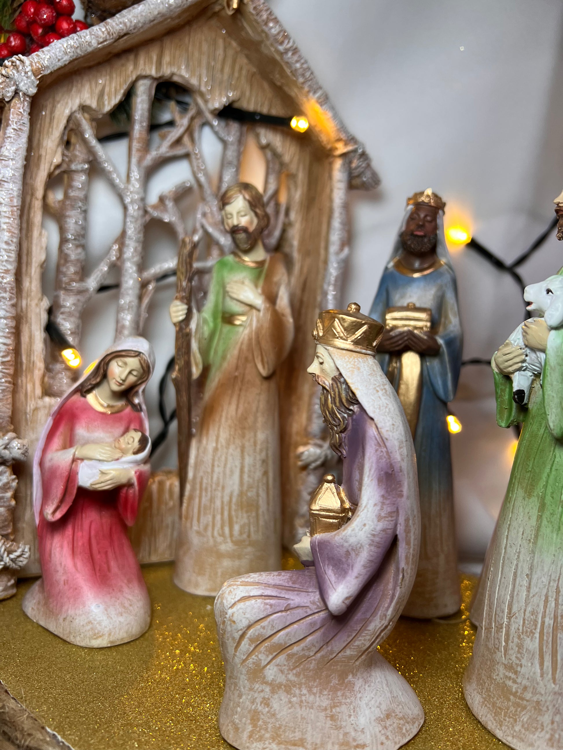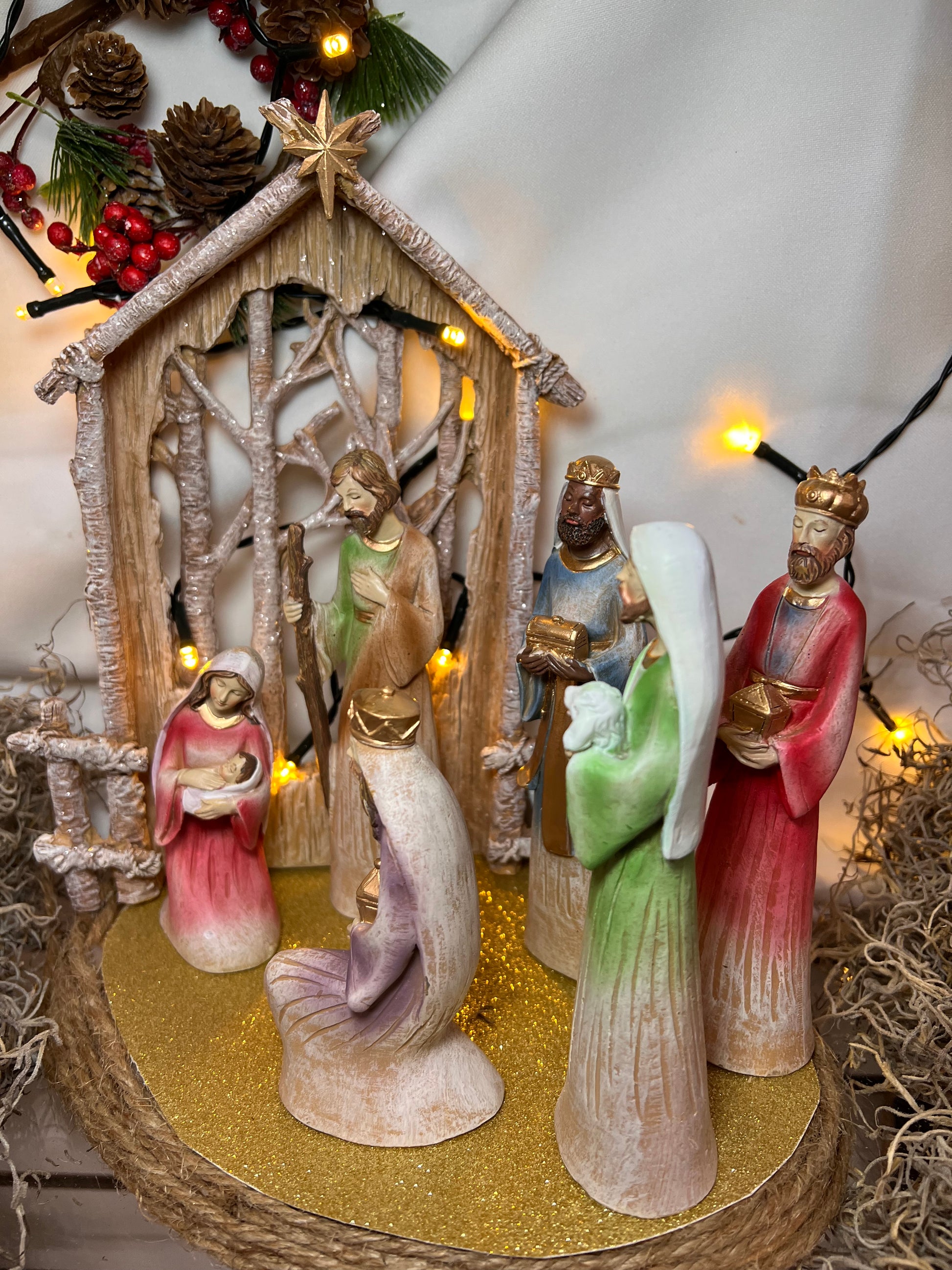 Softly shaded in gentle pastel tones, this 7-piece nativity set offers a peaceful and elegant take on the Christmas story. The branch-style stable adds a natural touch, while each figure from the Holy Family to the wise men and shepherd is crafted with simple yet meaningful detail. Its lighter colors brings a serene and graceful presence to your holiday decor.