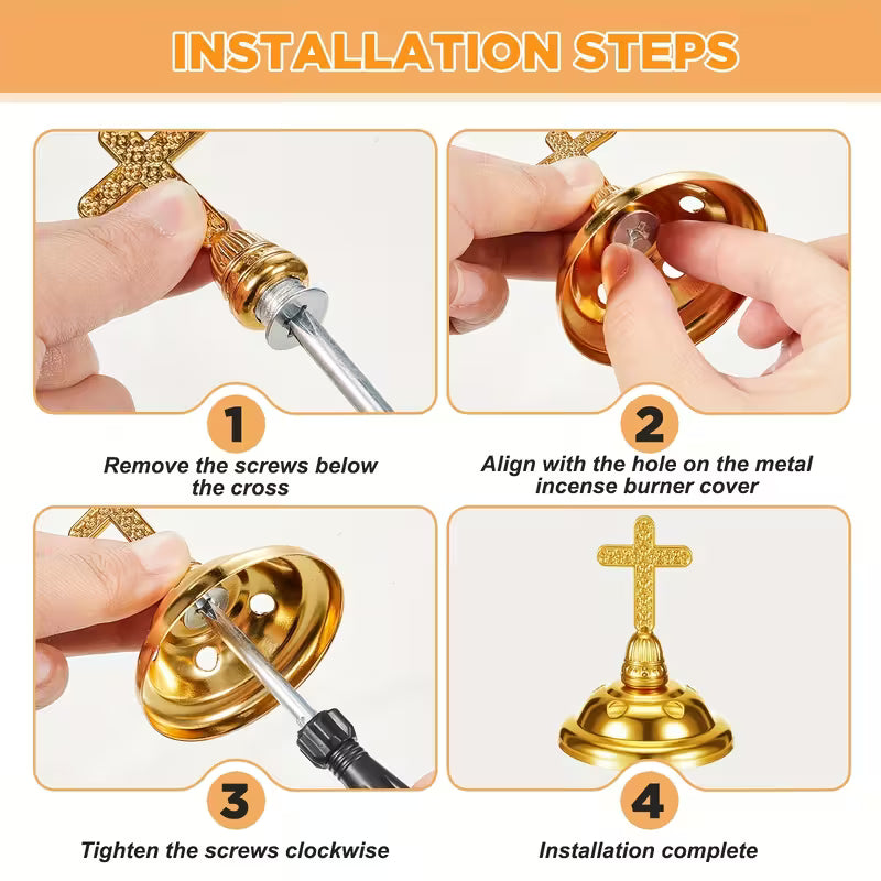 GOLDEN CHARCOAL INCENSE HOLDER W/ HANDLE & CROSS