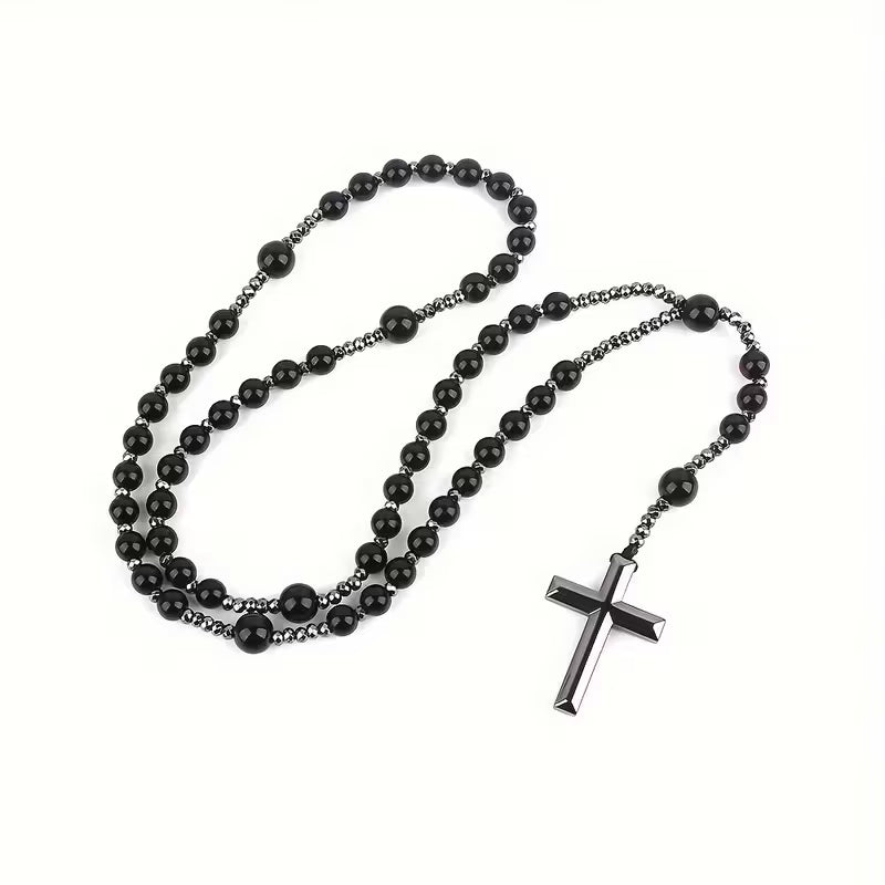 ROSARIO DE CUENTAS REDONDAS DE HEMATITA CON CRUZ DE OJO DE TIGRE DE PIEDRA NATURAL