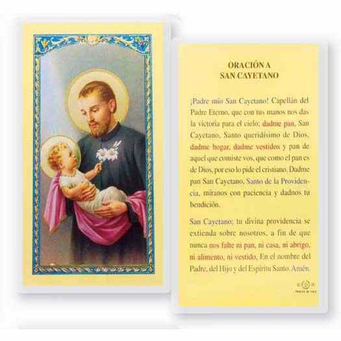 Estampa de Oración laminada con imagen de San Cayetano, y su oración al reverso. San Cayetano es invocado principalmente para obtener ayuda en asuntos relacionados con el trabajo, la estabilidad económica y la provisión de alimentos. Es el Santo Patrono de los deseadompleados y los que buscan trabajo.