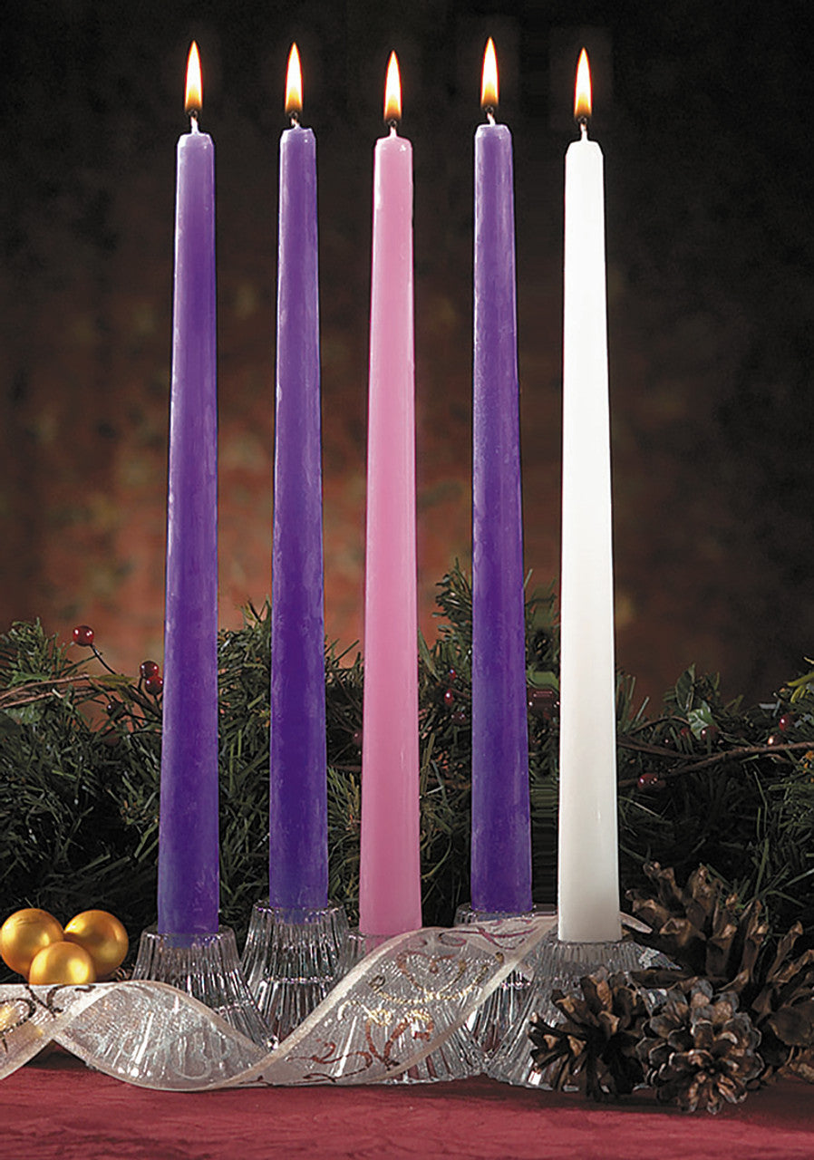 Many observe this holy season by lighting candles each of the four Sundays in Advent. Three of the candles are purple, reminding us to pray and serve others lovingly to help prepare the way for Jesus. The candle for the third Sunday of Advent is rose-colored. This color symbolizes our joy as the birth of Jesus draws near. On Christmas Eve a white Christ candle is lit along with the other four.