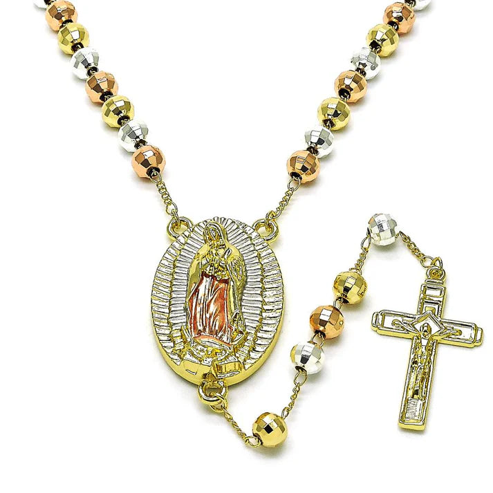 Exquisite tri colored designed 18k yellow gold layered rosary with large (1.5" tall) crosslink of Our Lady of Guadalupe and 1"H cross. Great quality for a low price, guaranteed.