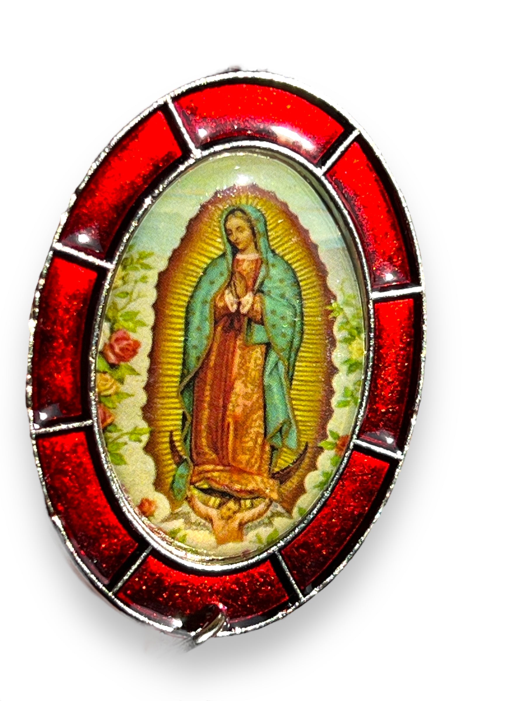 Metal with enamel finish oval auto devotional of Our Lady of Guadalupe (red). Great For Giveaways. Measures 2.5" oval, double faced.
