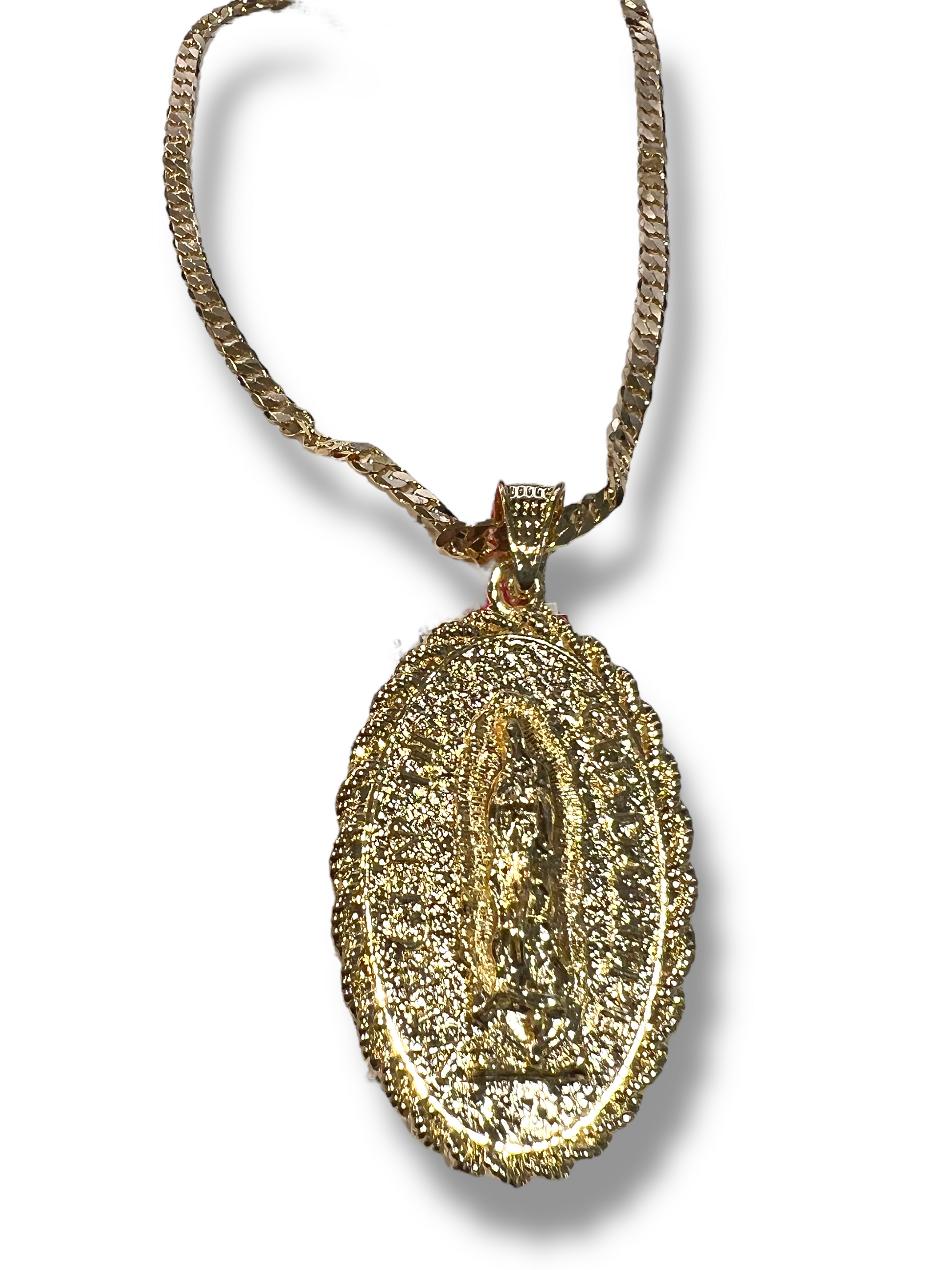 2"H LARGE ST. JUDE/OL GUADALUPE MEDAL WITH 24" CHAIN-18k GOLD LAYERED