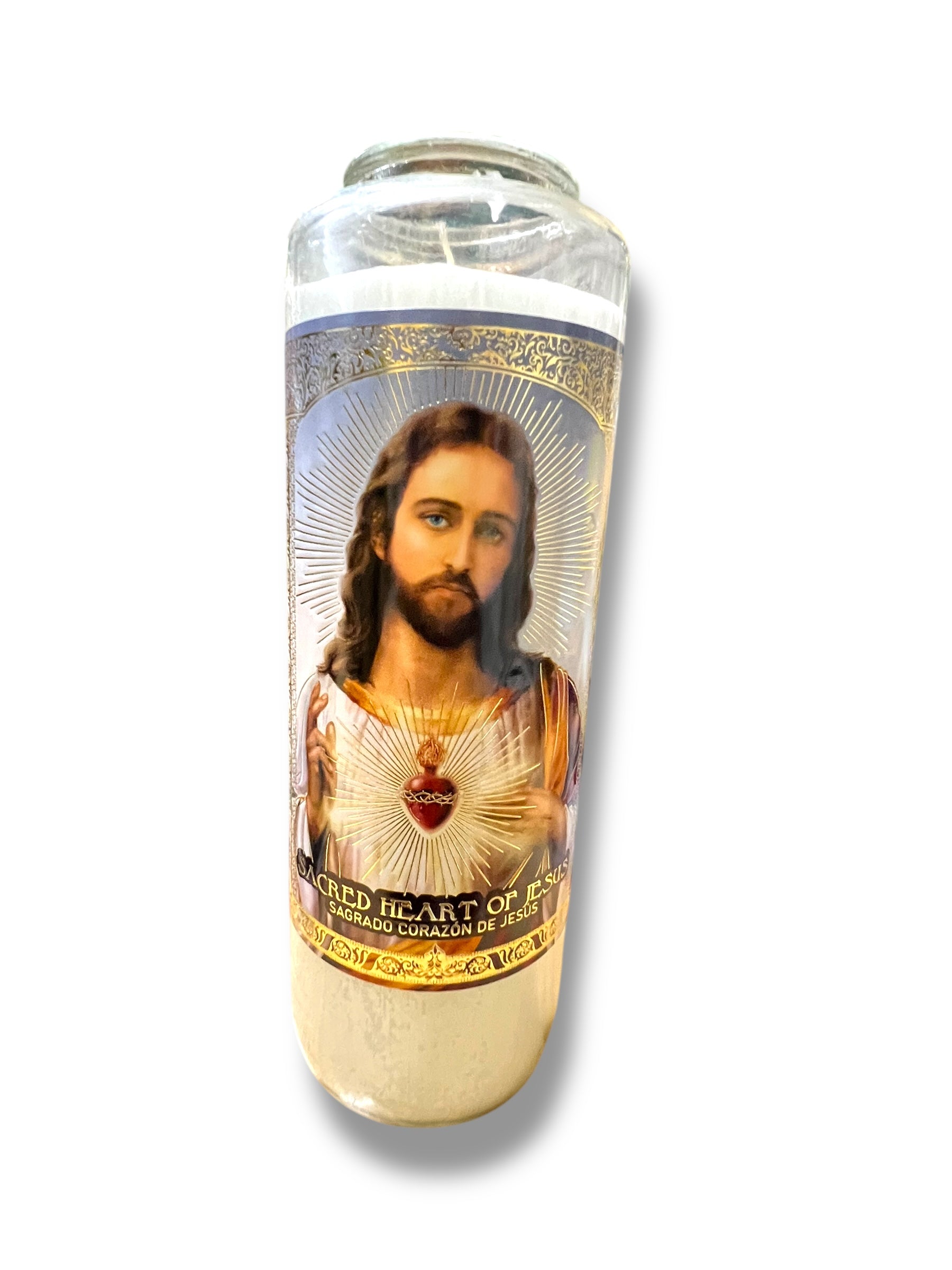 Experience a sense of devotion and tranquility with the Sacred Heart of Jesus devotional sanctuary candle. Crafted with the highest quality wax and poured into a safe and long-lasting glass container, this candle offers a 6-day burn time. You'll enjoy a uniform color, smoothness, and smokeless flame that will not damage your walls.