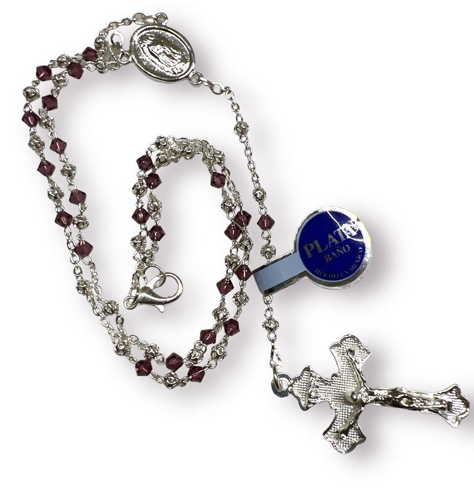 Rosario fino de cristal tornasol claro y a color lavanda/morado. El Rosario tiene una capa de plata, y broche para poder portar.