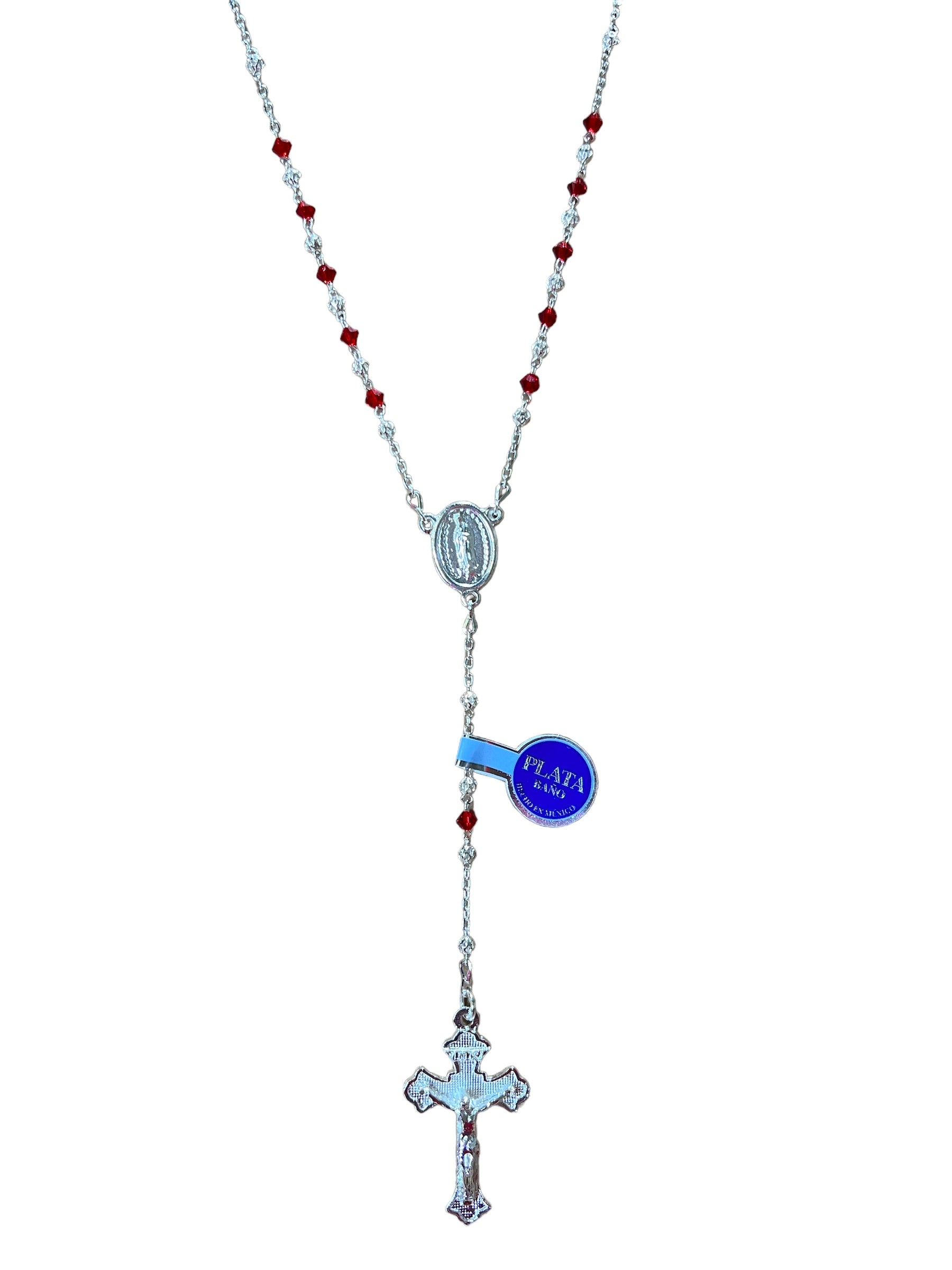 Rosario fino de cristal tornasol claro y a color escarlata. El Rosario tiene una capa de plata, y broche para poder portar.