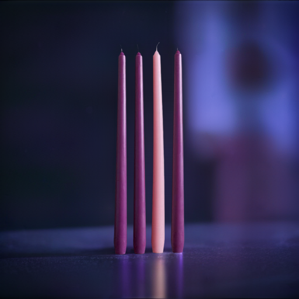 Many observe this holy season by lighting candles each of the four Sundays in Advent. Three of the candles are purple, reminding us to pray and serve others lovingly to help prepare the way for Jesus. The candle for the third Sunday of Advent is rose-colored. This color symbolizes our joy as the birth of Jesus draws near. On Christmas Eve a white Christ candle is lit along with the other four.