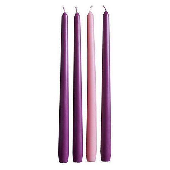 Each Advent candle set of 4 candles comes with 3 purple candles and 1 rose candle. Candleholders not included.