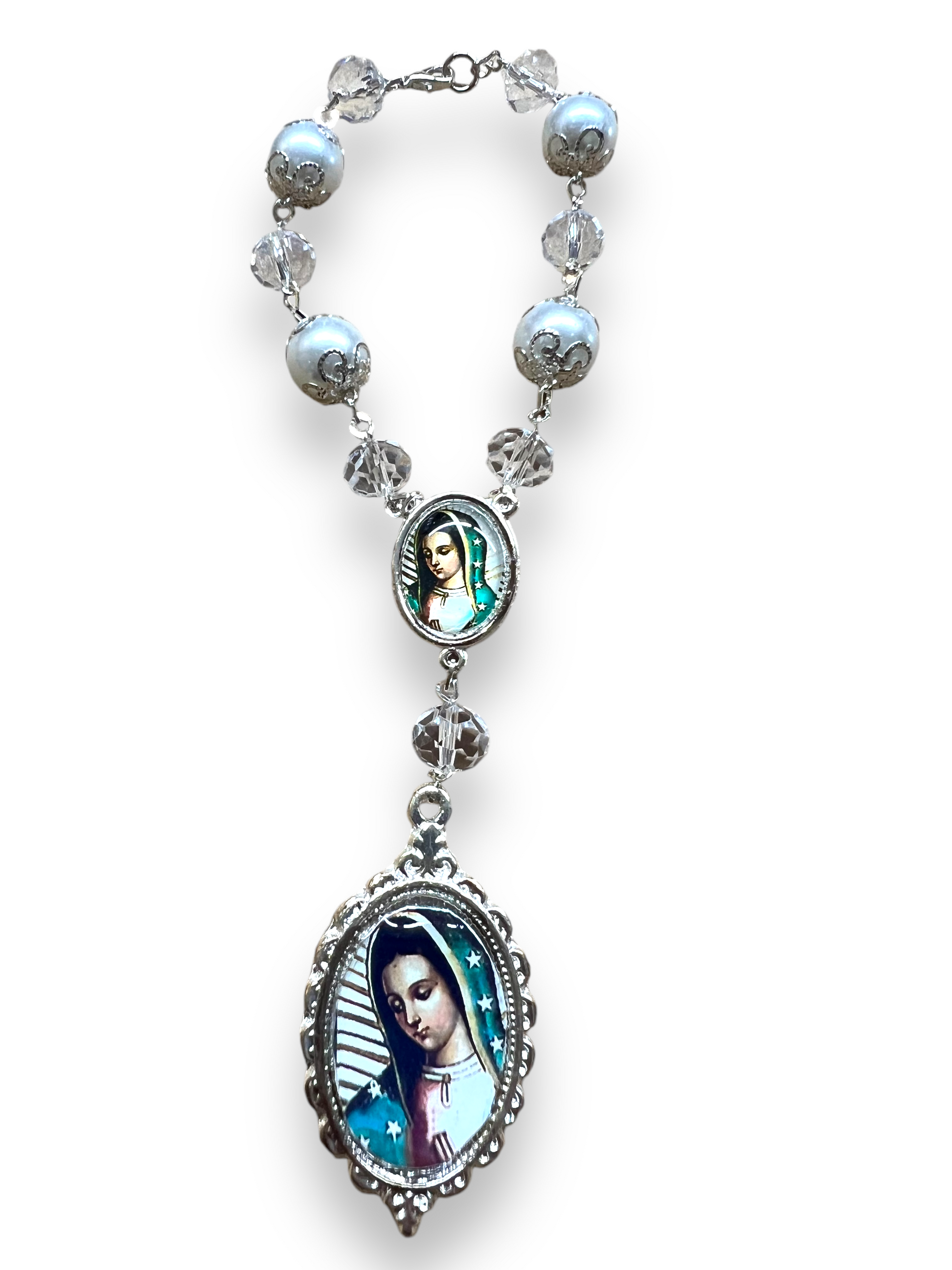 Allow yourself to connect to your spiritual being by reflecting and praying on the mysteries of the Holy Rosary while driving. This beautiful Our Lady of Guadalupe Auto Rosary which features charming silver accents is a one-decade rosary (decenary), featuring eye-catching imitation pearl and stunning crystal-colored beads that will adorn your car and act as a constant reminder of your faith.