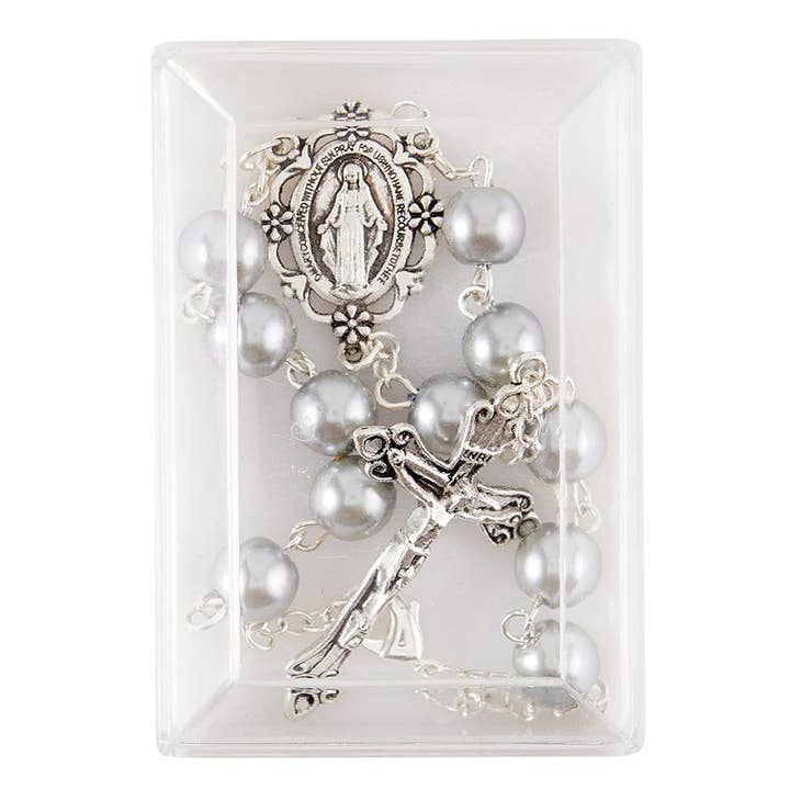 Features grey imitation pearl beads and a Miraculous centerpiece