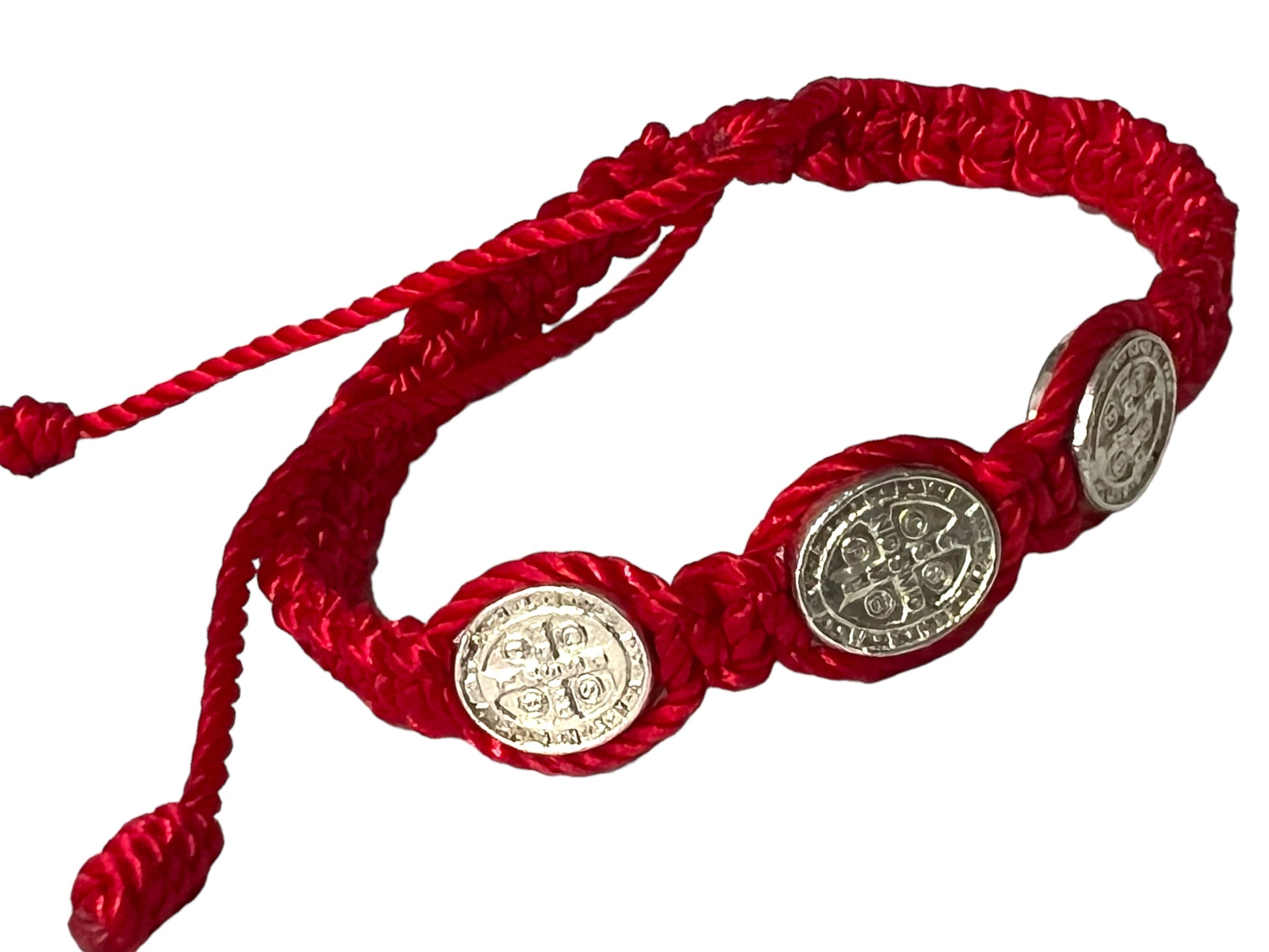 San Benito: Pulsera roja, tejida, con tres medallas de San Benito color plateadas. Hecho en México.