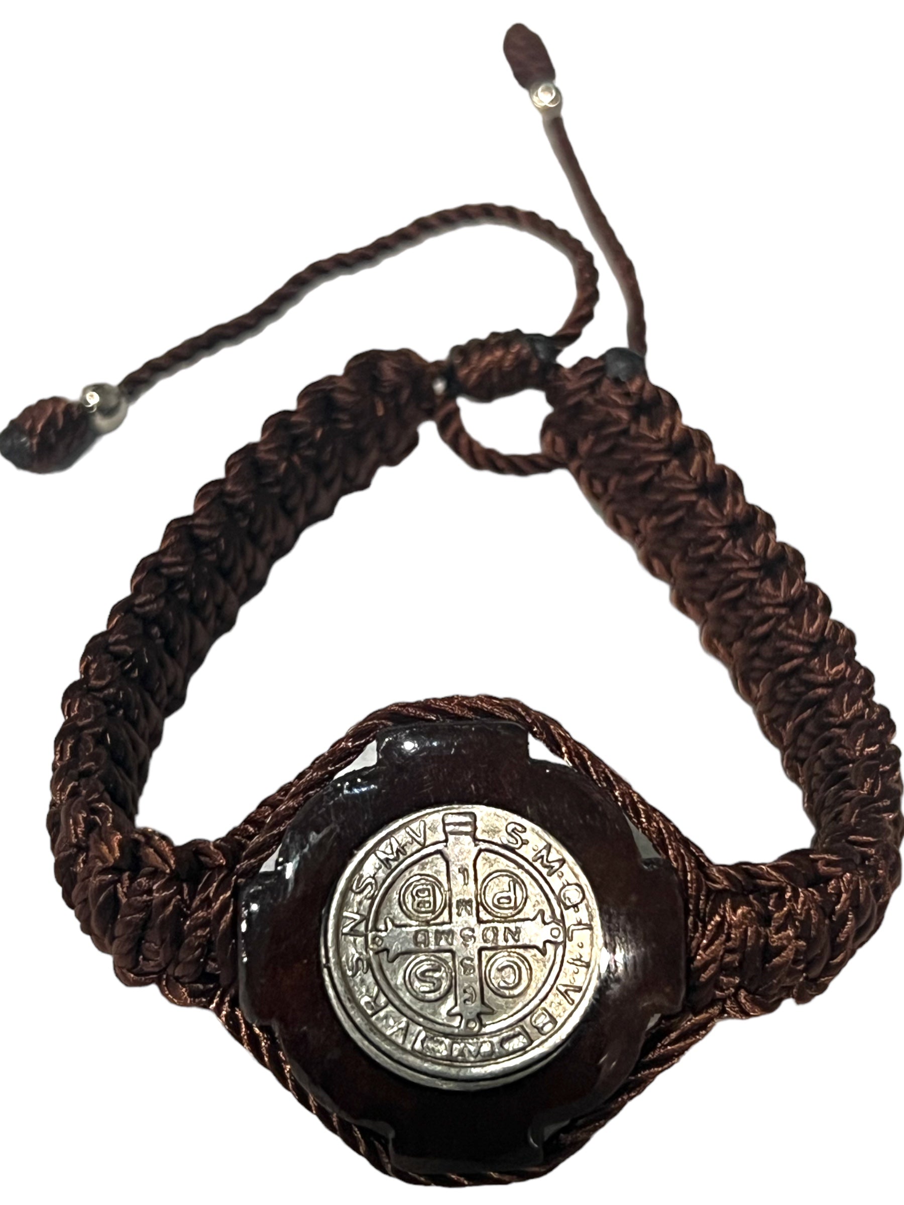 BROWN: Double braided St. Benedict Bracelet. 1/2" diameter silver colored medal on 1" diameter wood. Made in Mexico. Strong and durable thread.