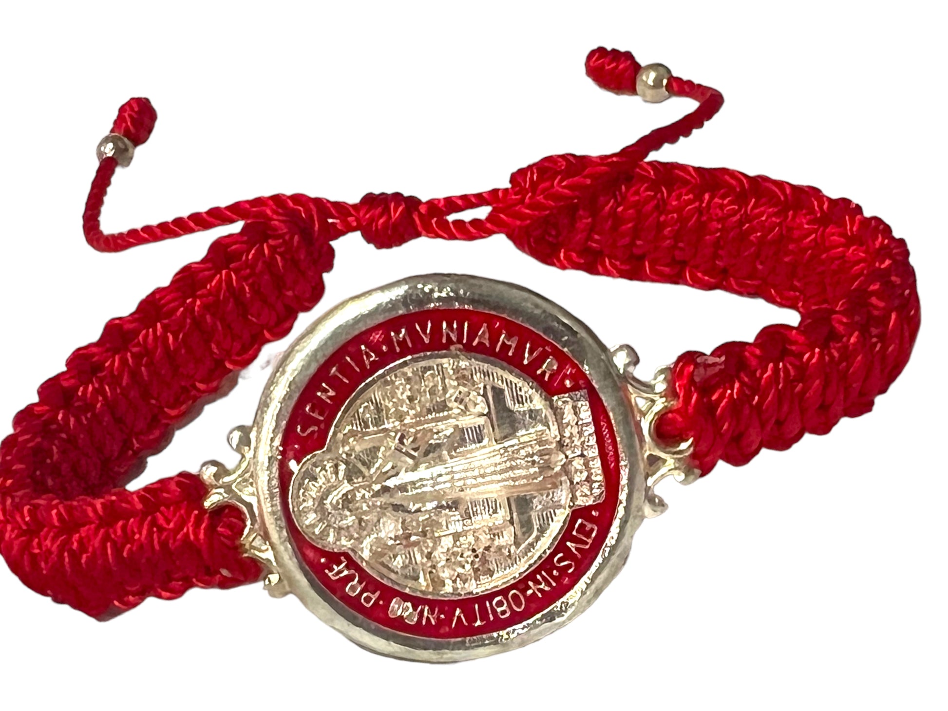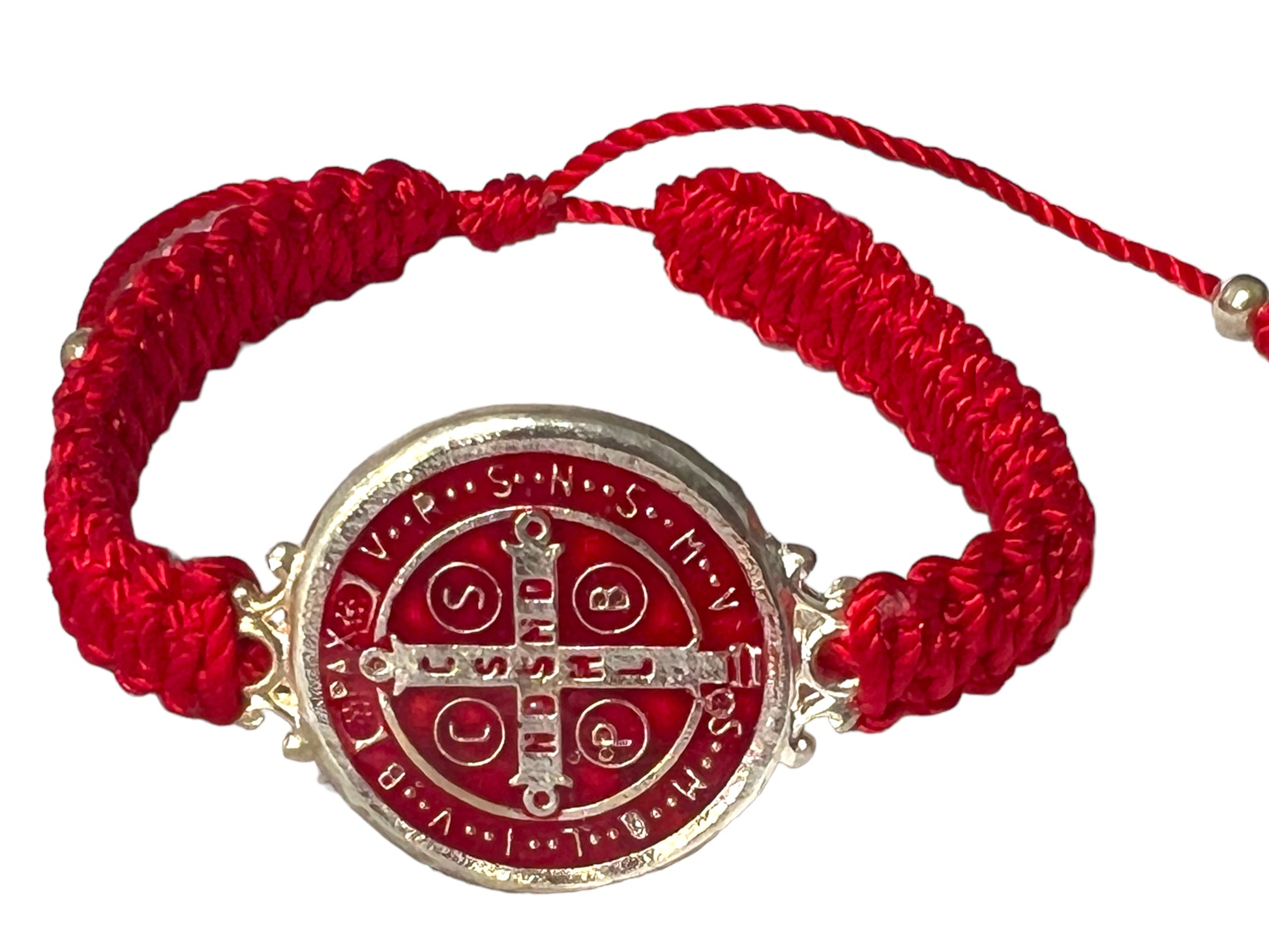 RED: Double braided St. Benedict Bracelet. Large medal (watch like style, 1" diameter). Made in Mexico. Strong and durable thread.