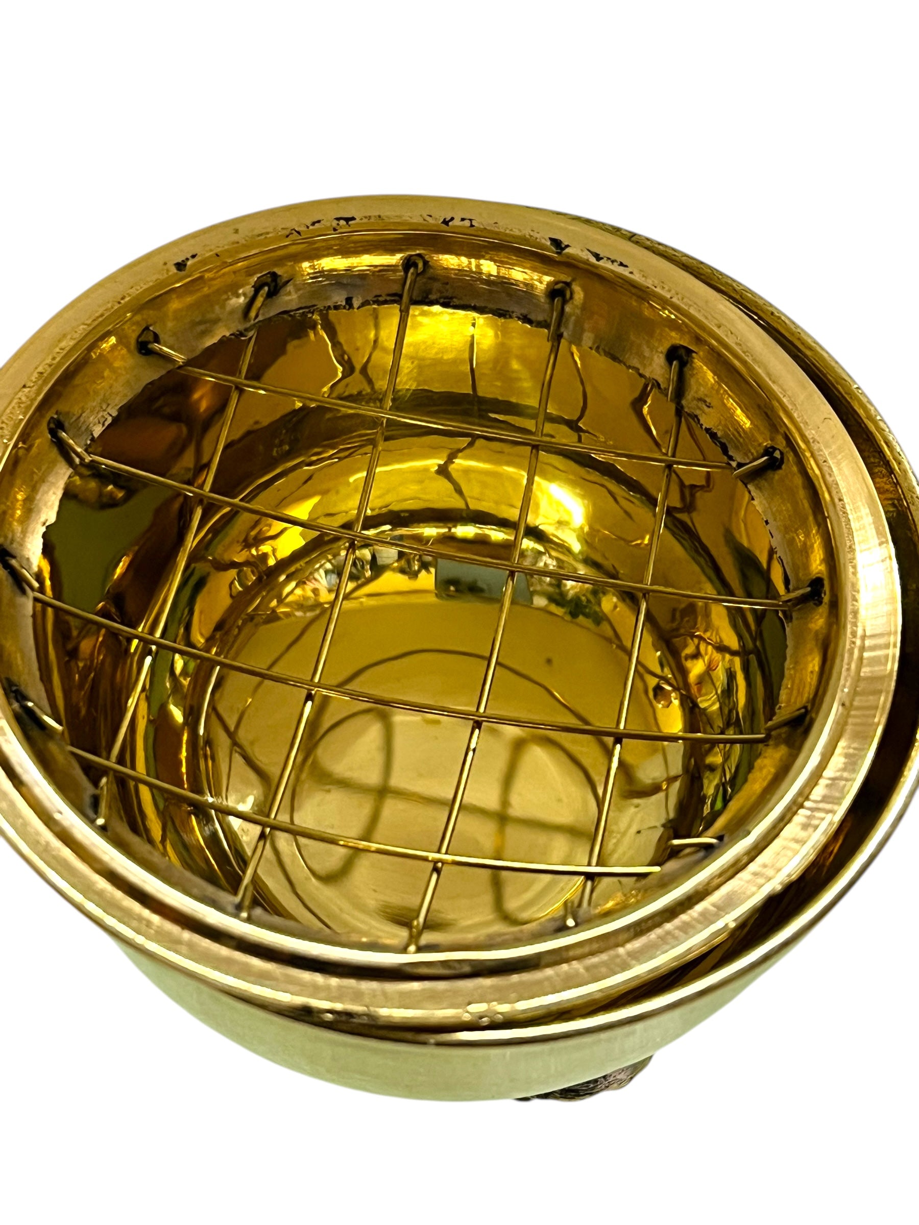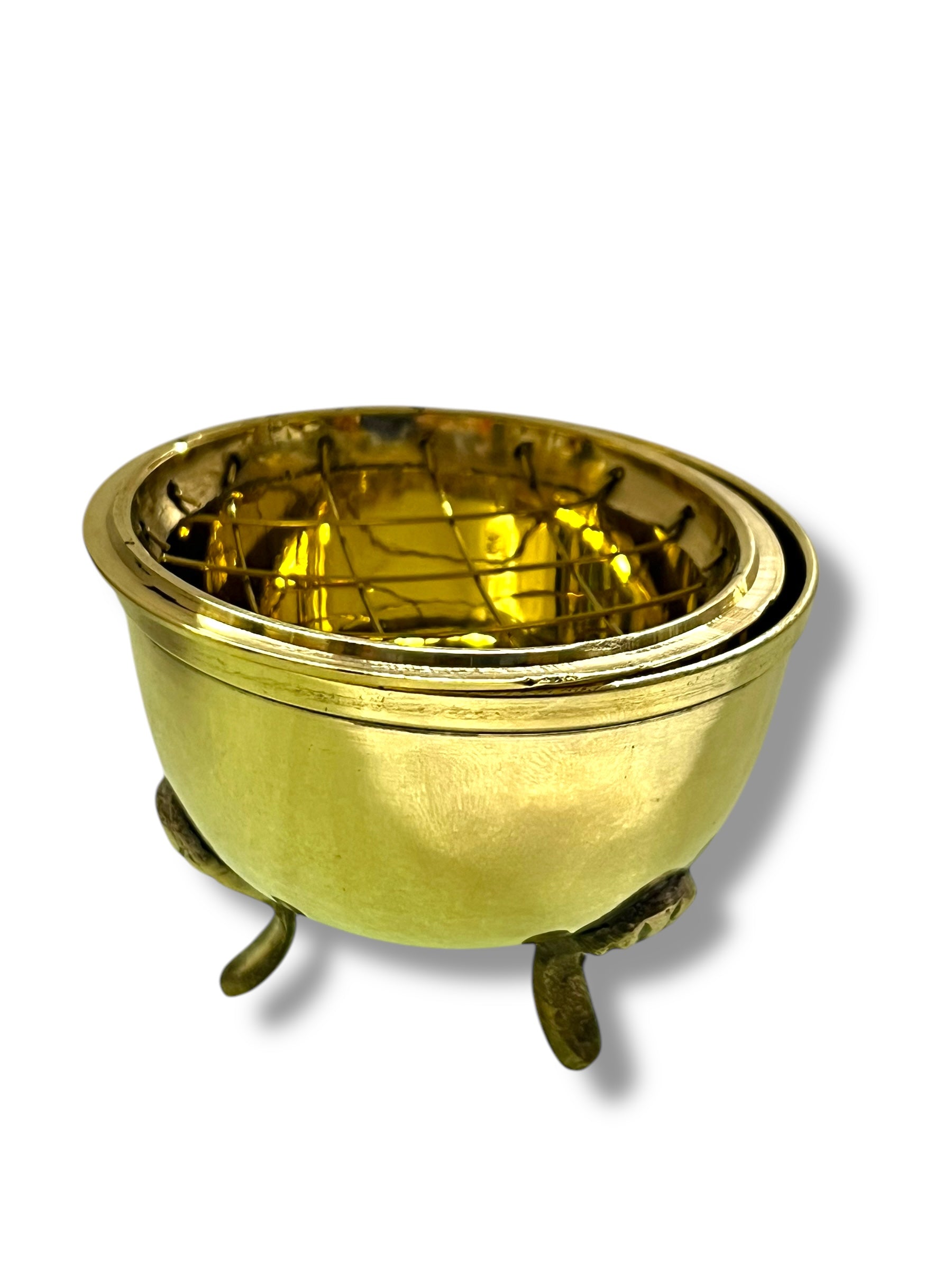 This Brass Charcoal Burning Resin Incense Burner with screen stands on three legs. The removable screen on this incense burner allows ash to fall through, while keeping the charcoal and resins on top.