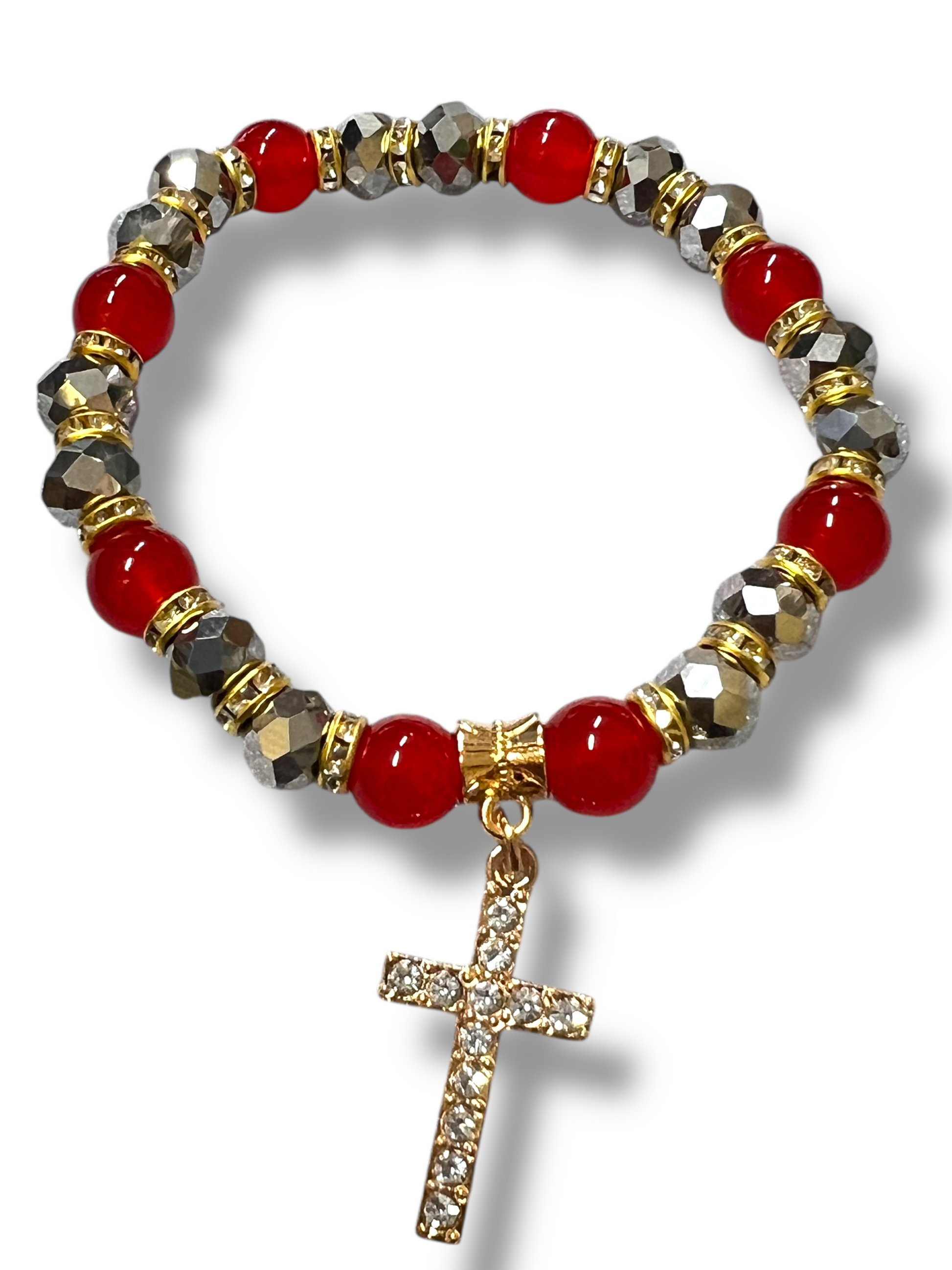 Pulsera de vidrio a color con cruz colgante de diamantina -una talla para todos.