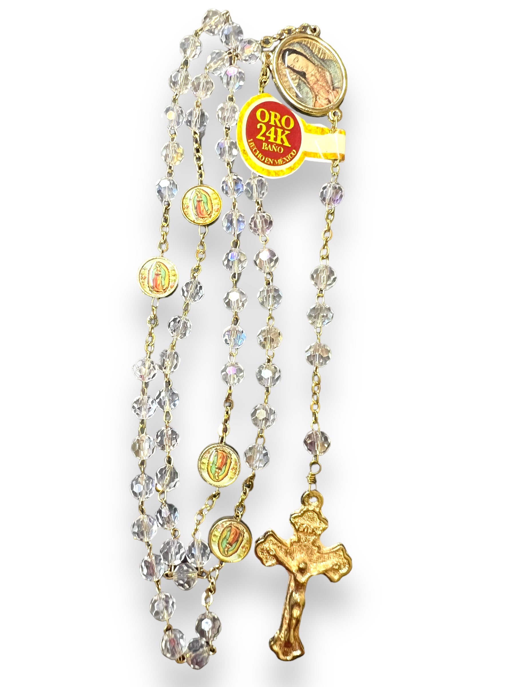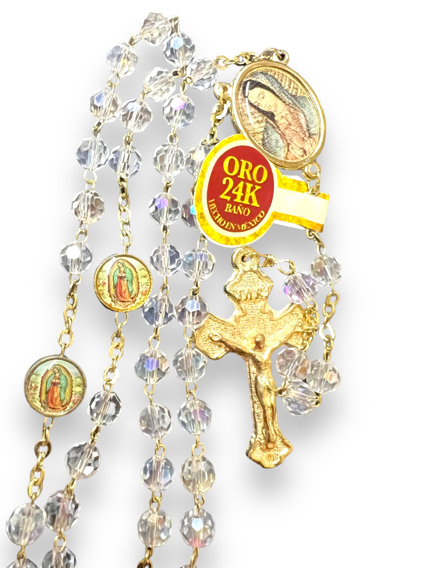 Hermoso rosario de 18.5" pulgadas de la Virgen de Guadalupe. Rosario está hecho de vidrio fino y con cuenta de 6mm e imagen a color doble lado en el centro y en cada Padre Nuestro. Hecho en México con cadena estilo italiano y leve capa de oro de Centenario.