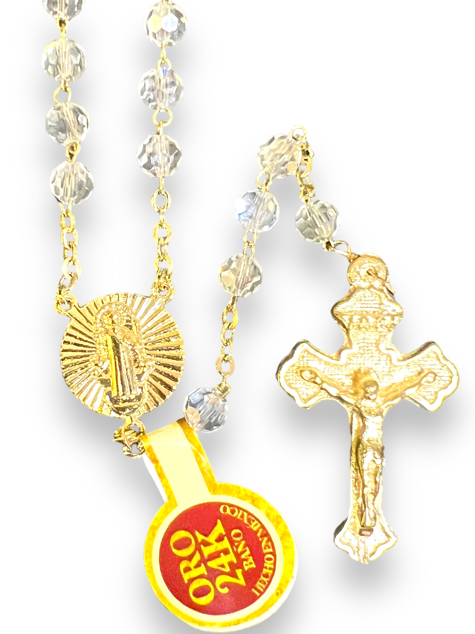 Beautiful St. Benedict 18.5" 8mm fine glass bead rosary made in Mexico with Italian style links and a light coat of Centenario gold. Each Our Father link has small St. Benedict medal and a beautiful center link with St. Benedict on it.