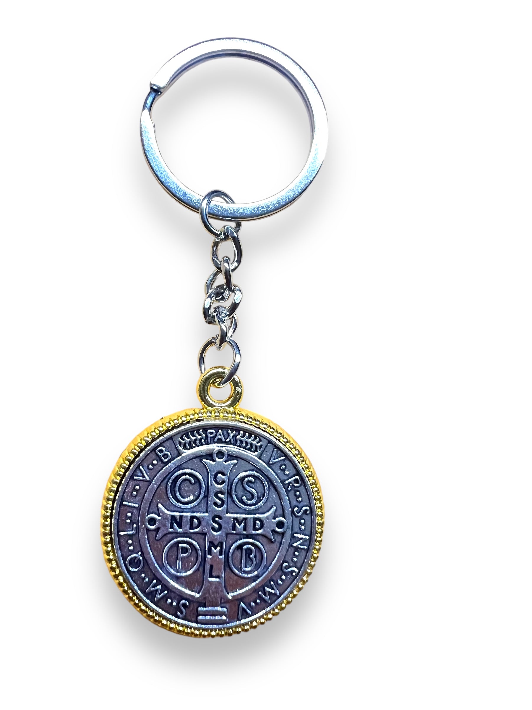 1.5" diameter St. Benedict Medal Keychain, with gold rim, double faced. St. Benedict Medal is one of the most powerful sacramentals to wear and use. It contains a powerful prayer that is an exorcism on its own. We believe in the power of energy and the importance of intentions, which is why all of our jewelry, including this protection bracelet, is thoughtfully made for you to get it blessed.