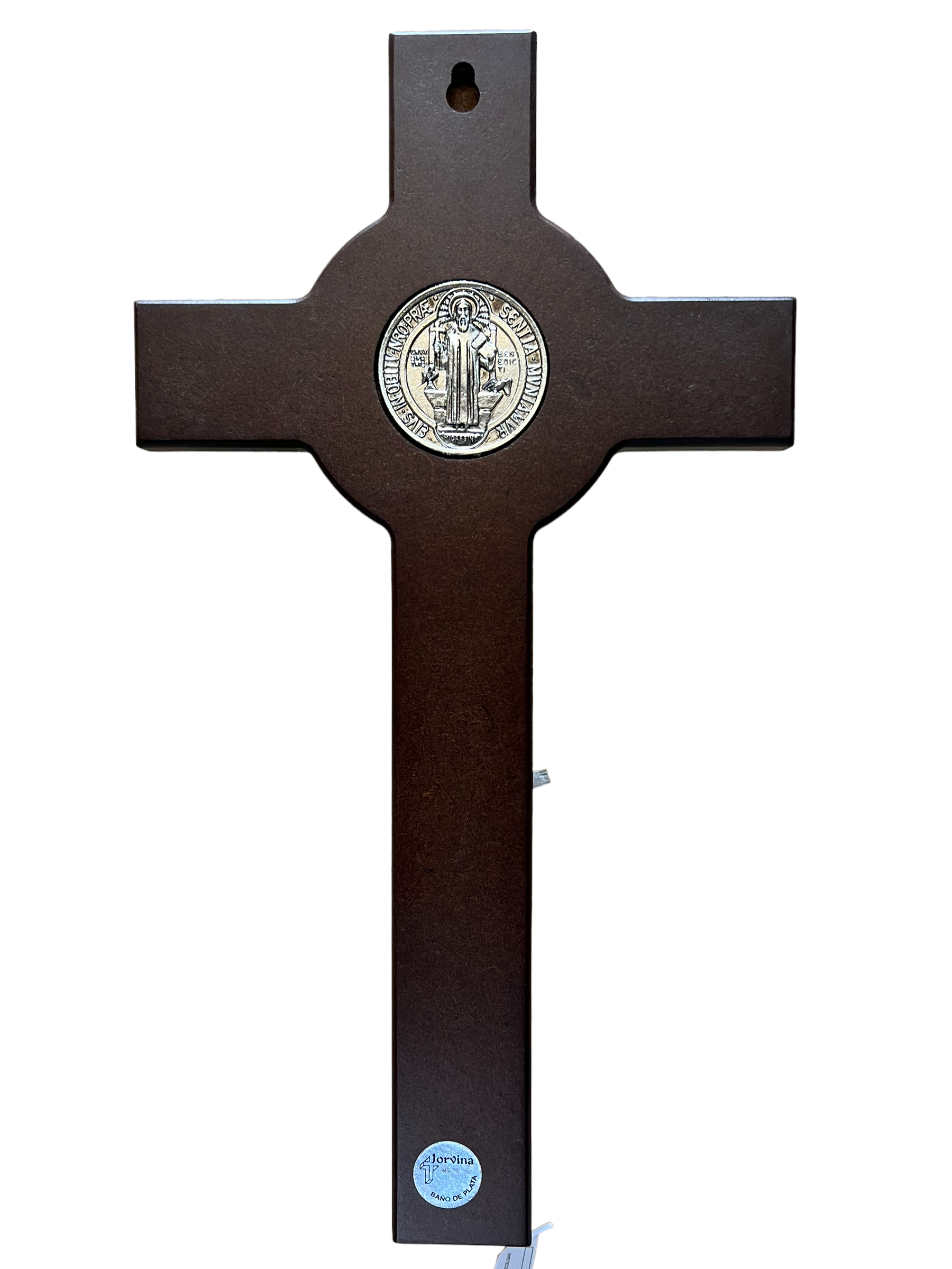 Wooden St. Benedict Cross with medal on back and front and bodice silver plated. Measures approx 13". Made in Mexico.