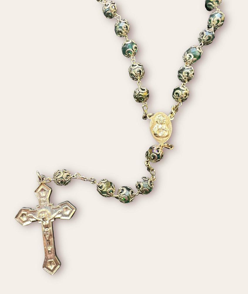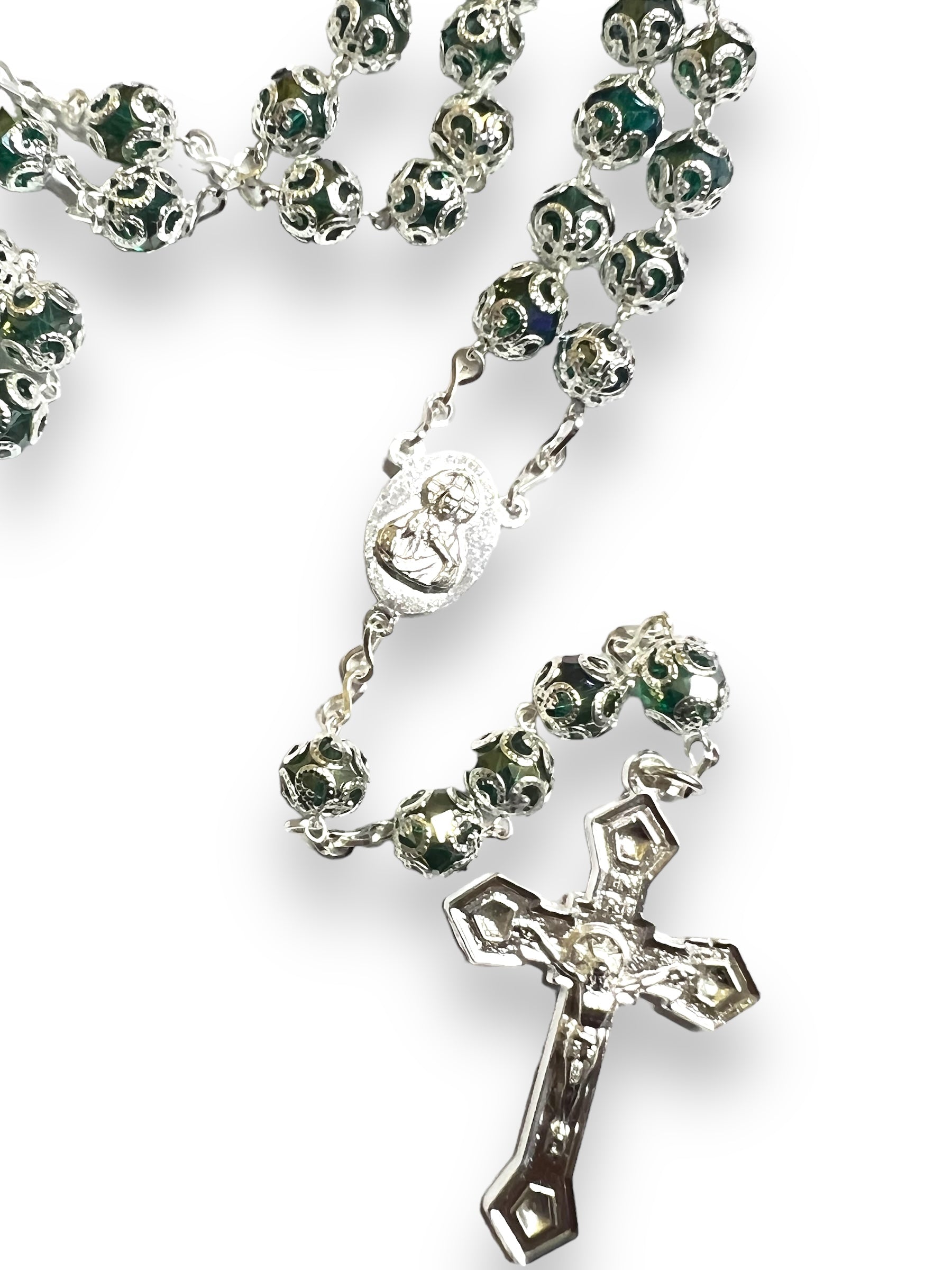Deluxe crystal Aurora Borealis capped silver metal Rosary with 7mm beads. Rosary measures 22" in length. Crystal color is emerald green with double-faced cross link featuring Our Lady of Guadalupe and Sacred Heart of Jesus.