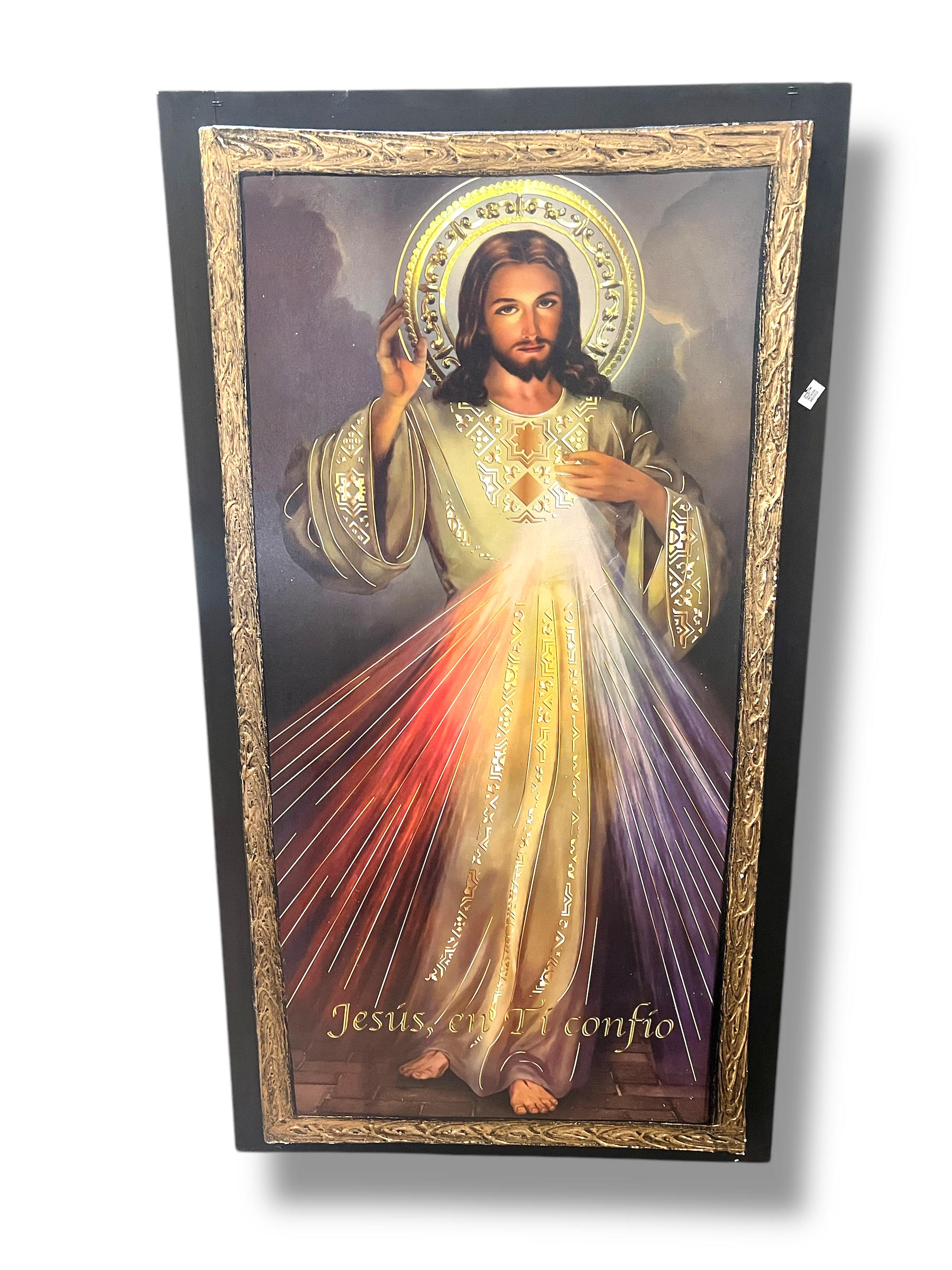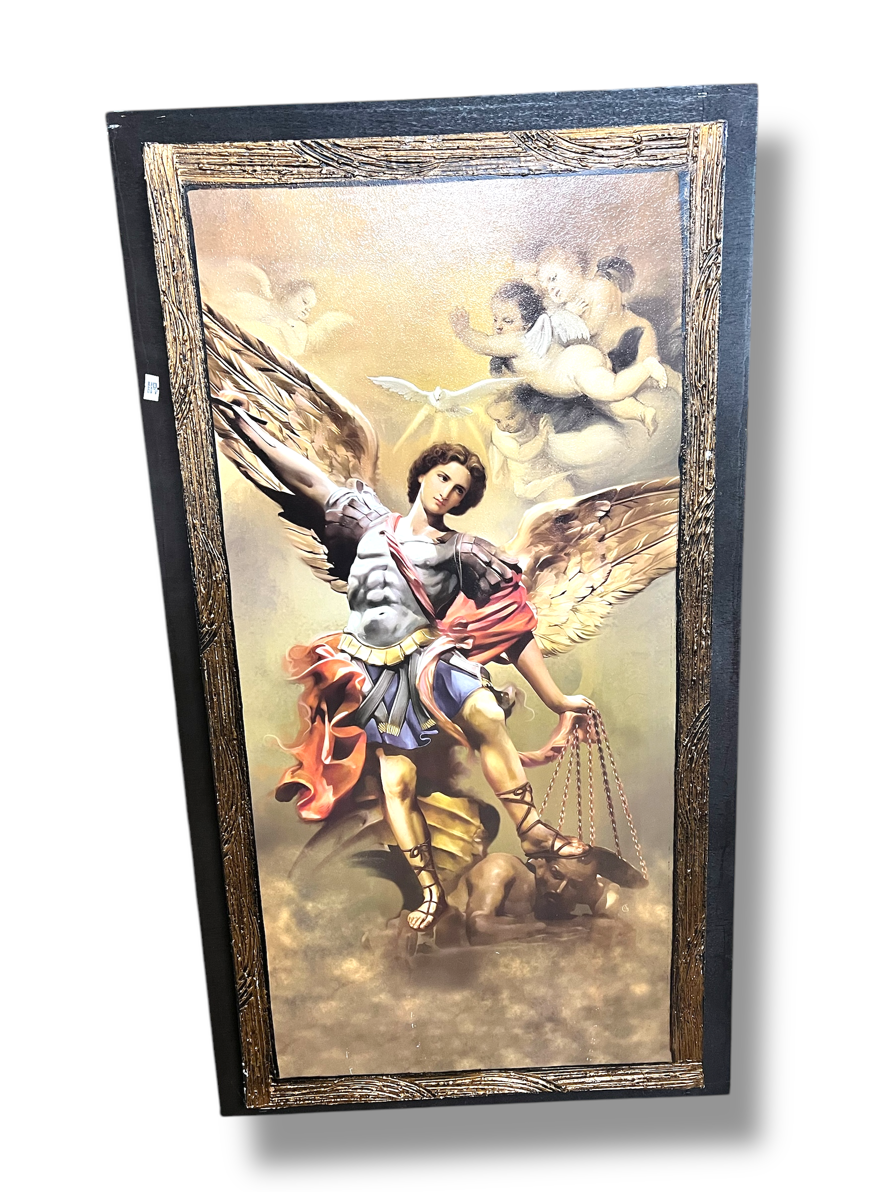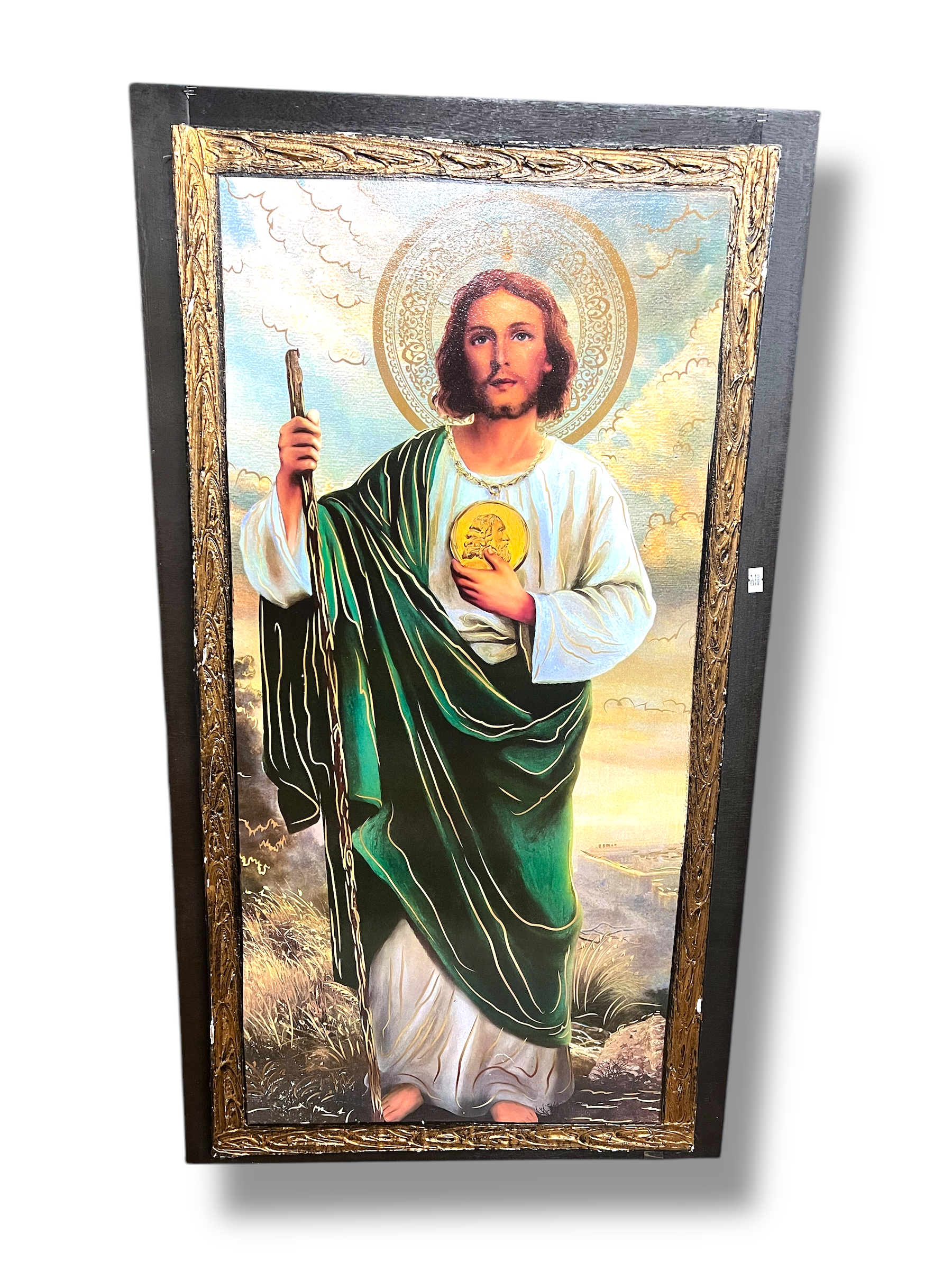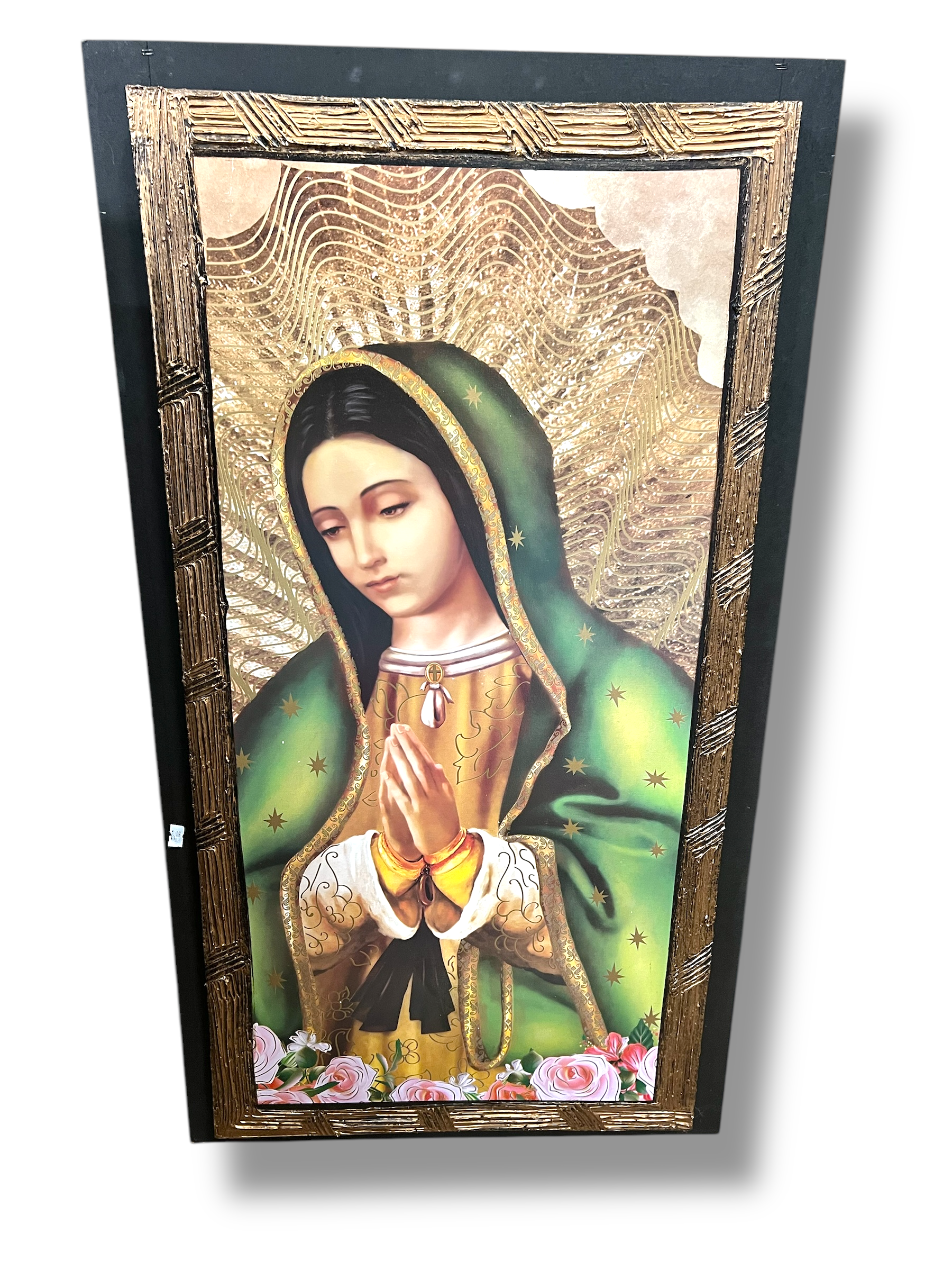 34"x18" Silk-screened printed canvas (oil painting replica style) with stylish texturized edging mounted on rustic wooden supported frame. Overall frame size 38"x21"