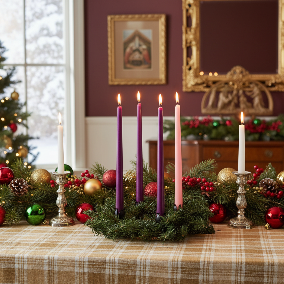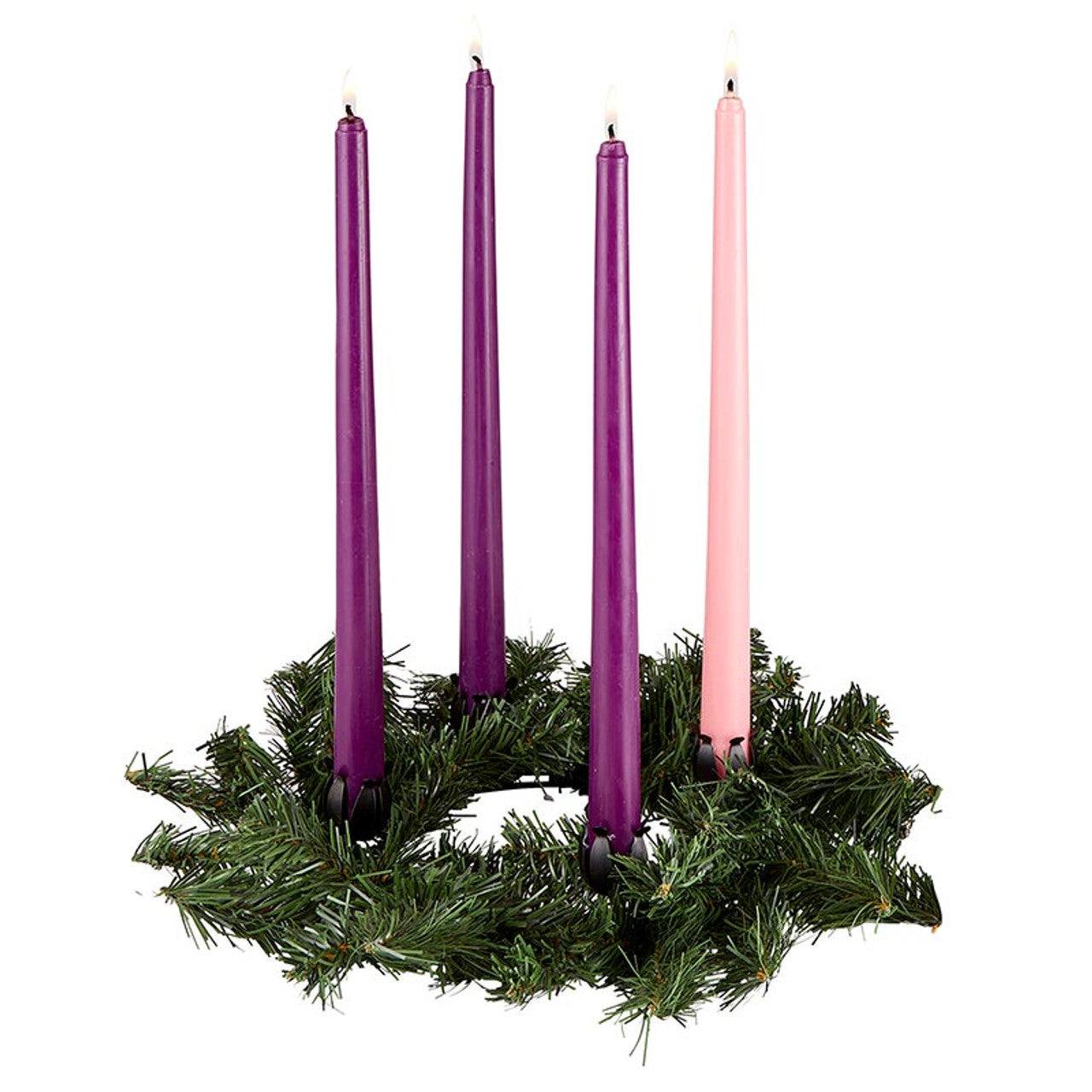 - Features three purple candles, reminding us to pray and serve others lovingly to help prepare the way for Jesus, and one rose candle for the third Sunday of Advent which symbolizes our joy as the birth of Jesus draws near.