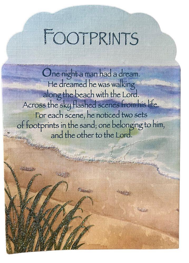 One night a man had a dream. He dreamed he was walking along the beach with the LORD. Across the sky flashed scenes from his life. For each scene he noticed two sets of footprints in the sand: one belonging to him, and the other to the LORD. When the last scene of his life flashed before him, he looked back at the footprints in the sand. He noticed that many times along the path of his life there was only one set of footprints. He also noticed that it happened at the very lowest and saddest times in his life. This really bothered him and he questioned the LORD about it: "LORD, you said that once I decided to follow you, you'd walk with me all the way. But I have noticed that during the most troublesome times in my life, there is only one set of footprints. I don't understand why when I needed you most you would leave me." The LORD replied: "My son, my precious child, I love you and I would never leave you. During your times of trial and suffering, when you see only one set of footprints, it was then that I carried you."