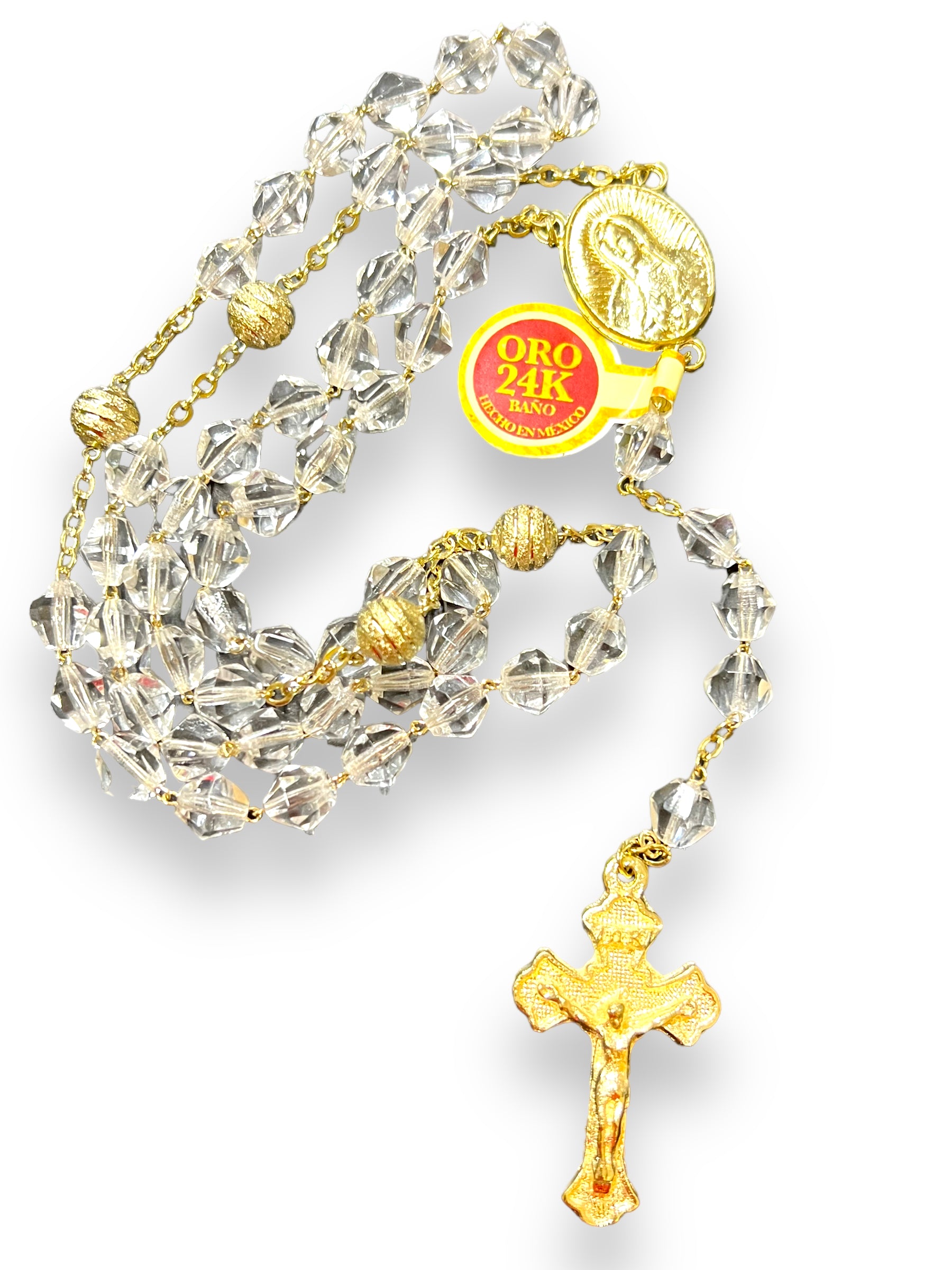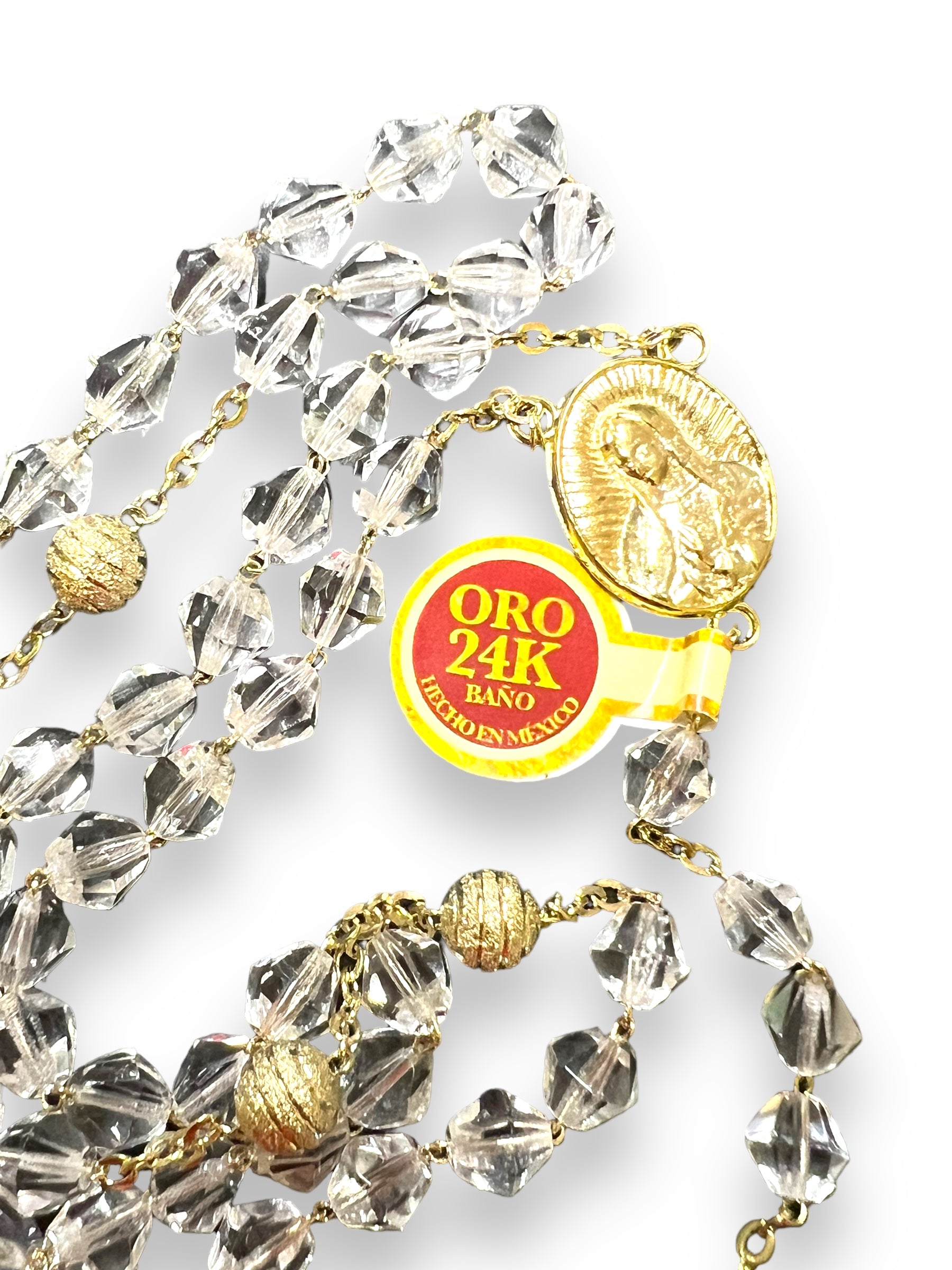 Hermoso rosario de 20" pulgadas de la Virgen de Guadalupe de vidrio fino y con cuenta de 8mm hecho en México con cadena estilo italiano y leve capa de oro de Centenario.
