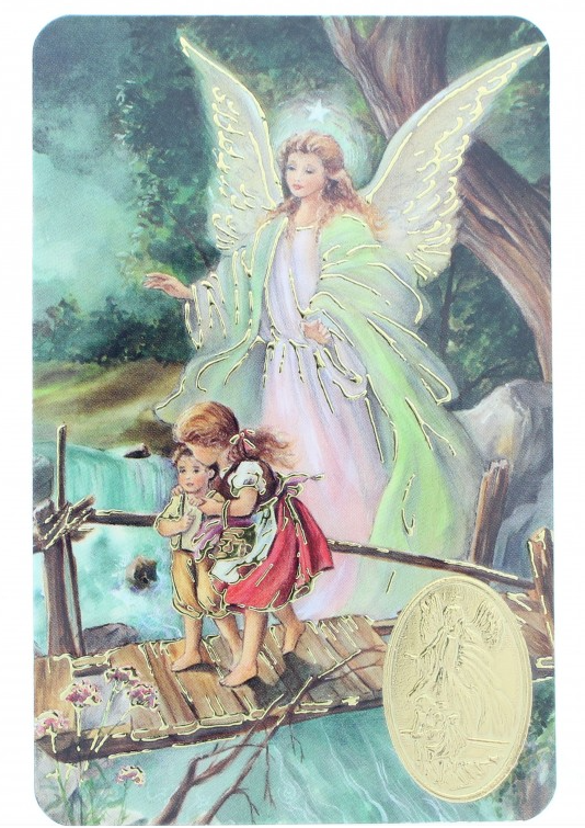 Italian designed holy prayer card to Guardian Angel with medal incrusted into the card.