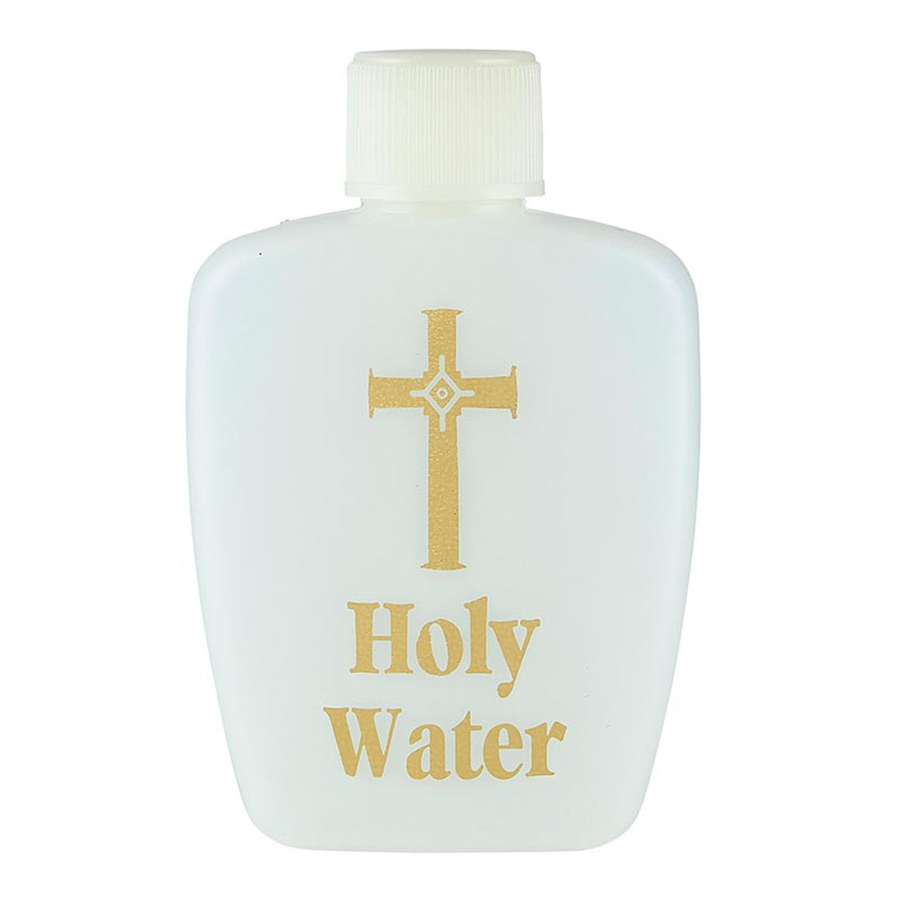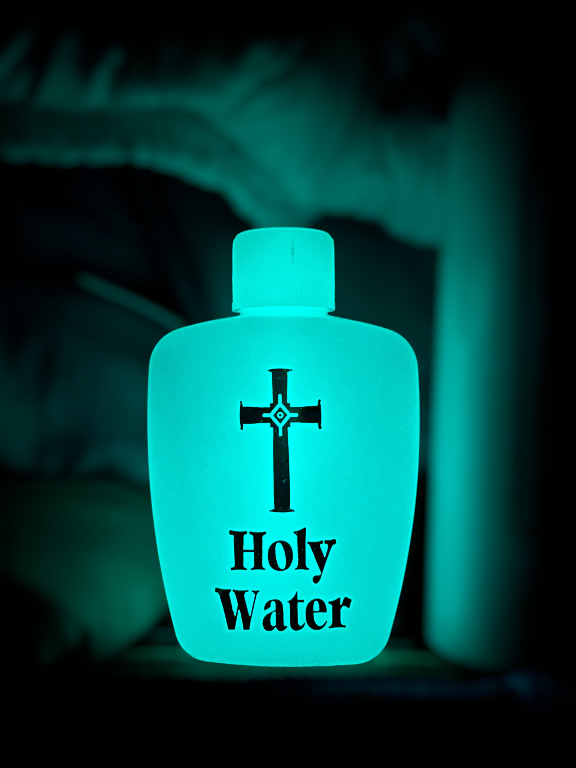This Luminous Holy Water Bottle charges under sunlight to emit a radiant glow. It holds 2 ounces of water and features a convenient screw-off lid with a removable dispenser. Crafted from molded plastic for durability and ease of use.