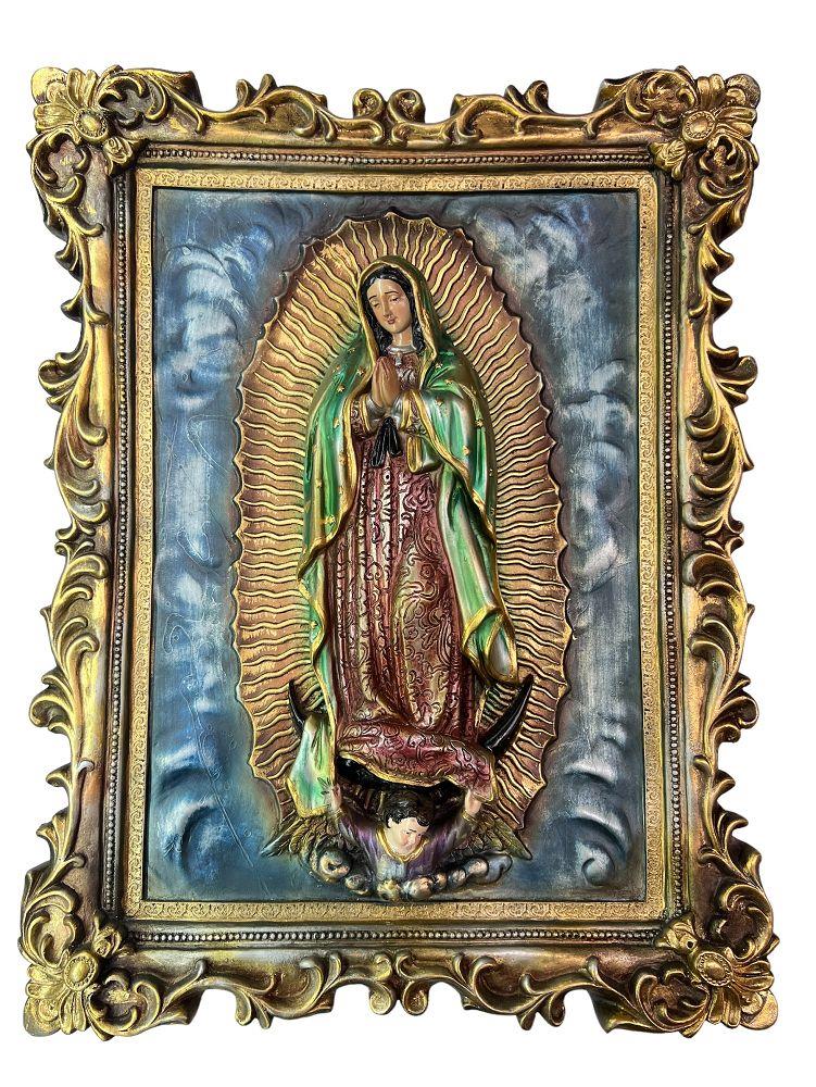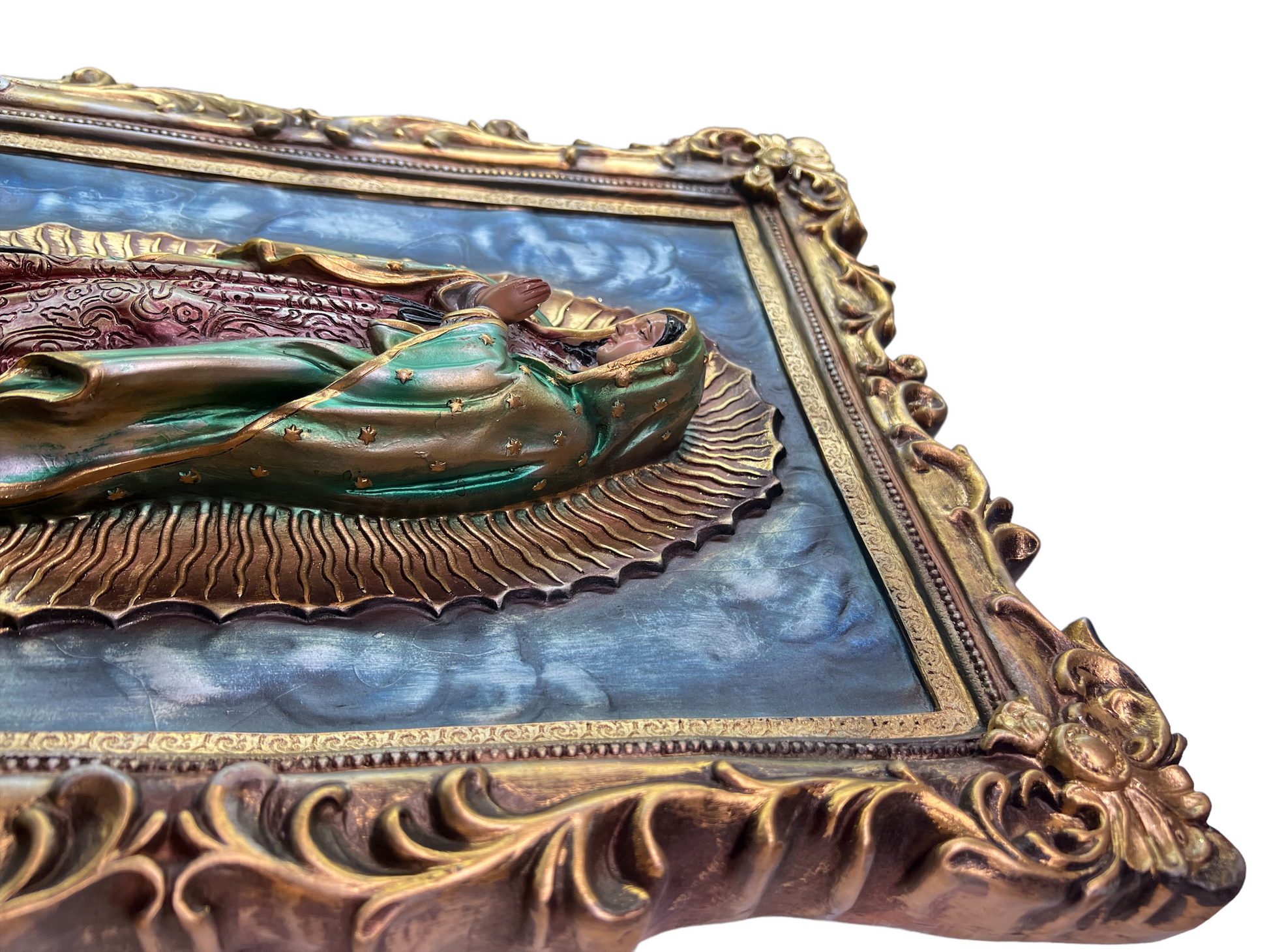 20"x14" 3D frame of Our Lady of Guadalupe Frame. Hand-painted, with Metalic finish and gold accents, resin. Made in Mexico.
