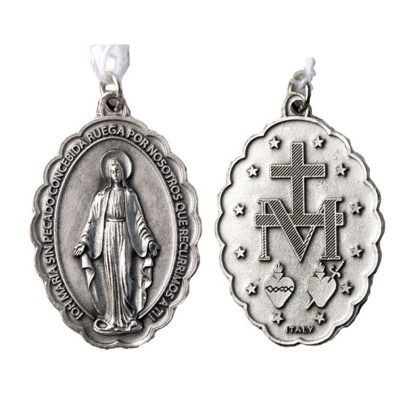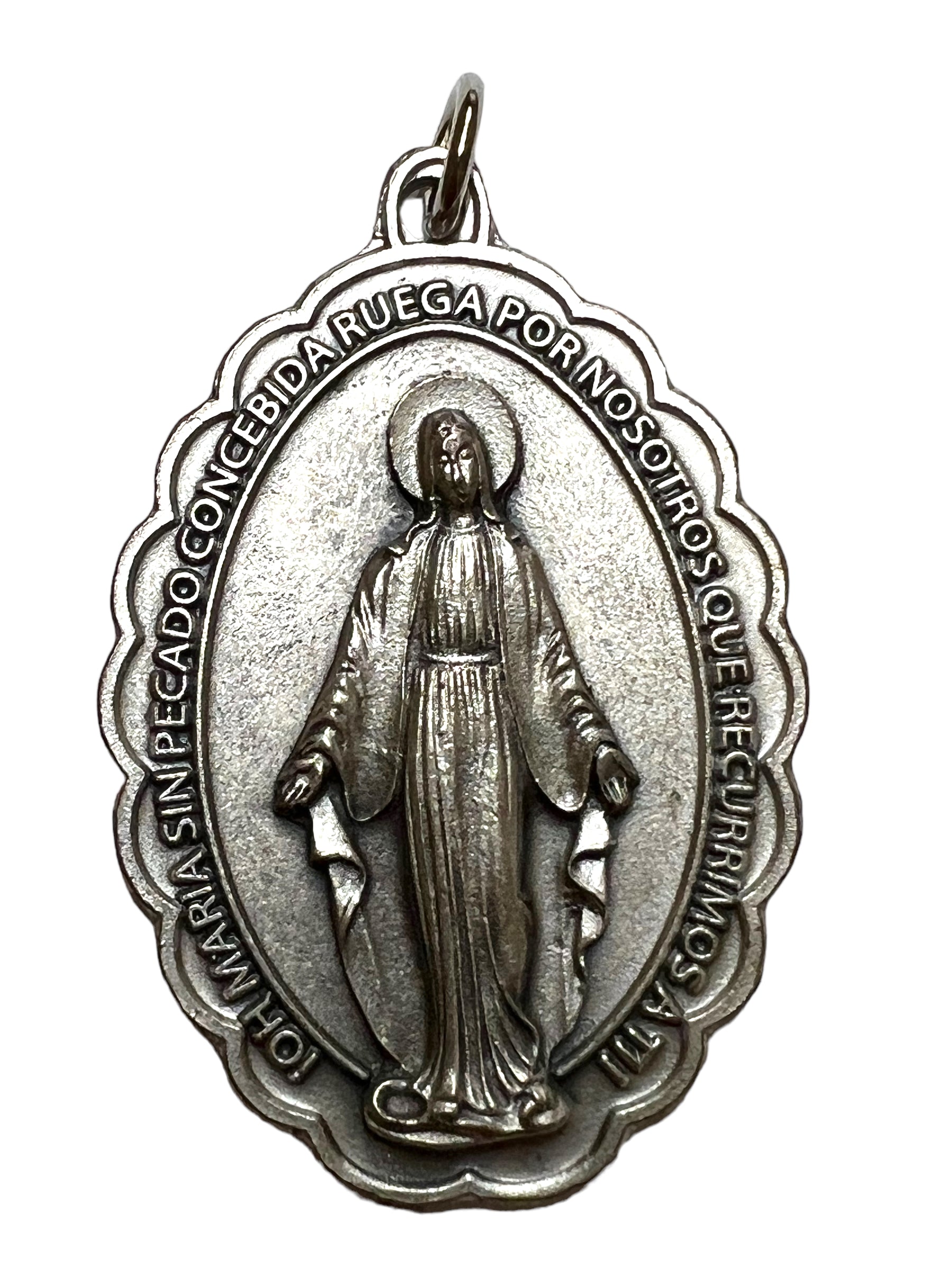 Medalla grande (2 pulgadas, ovalada) de metal inoxidable, Virgen de la Medalla Milagrosa. Italiana. Disponible con inscripción en Español: (¡Oh María sin Pecado Concebida Ruega por Nosotros Que Recurrimos a Ti!)