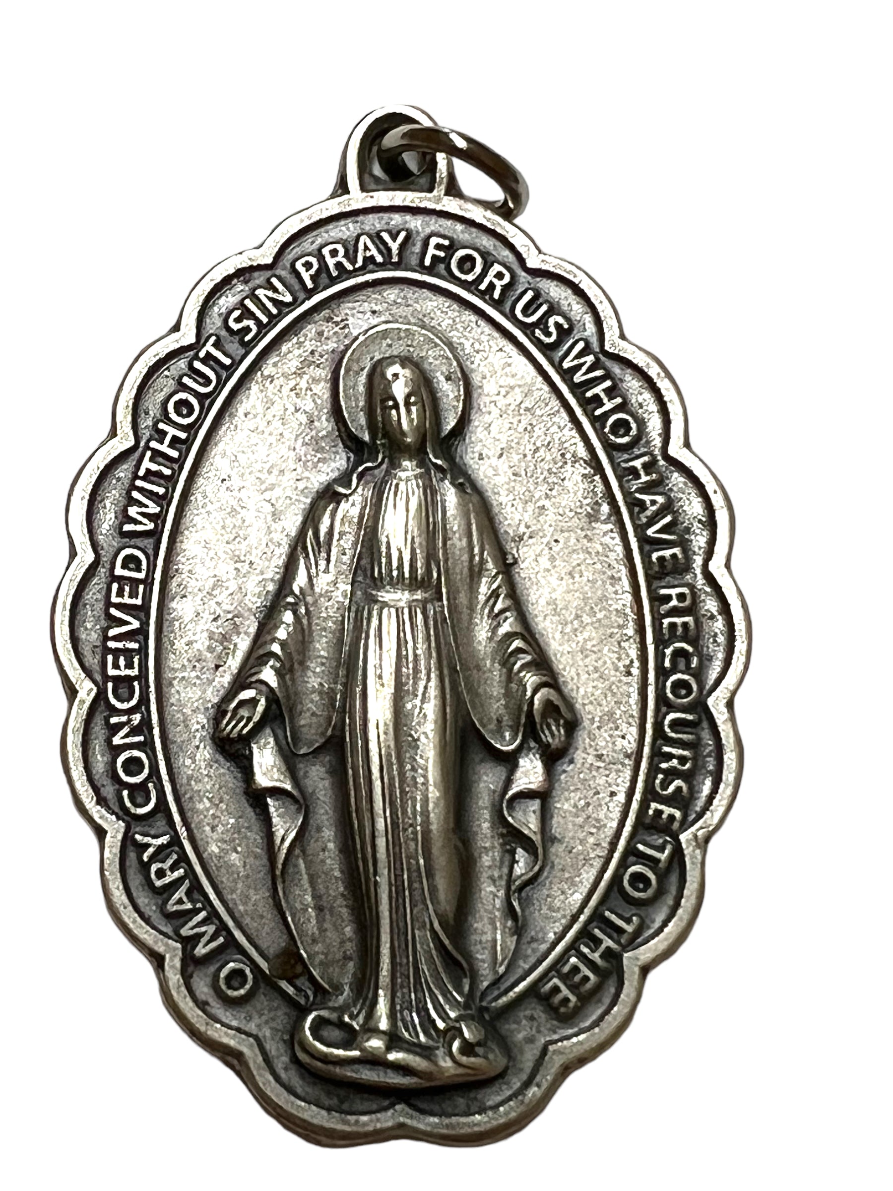Large (2" oval) medal of Our Lady of Miraculous Medal, Italian. Inscription available in English (O Mary Conceived without Sin Pray For Us Who Have Recourse to Thee)