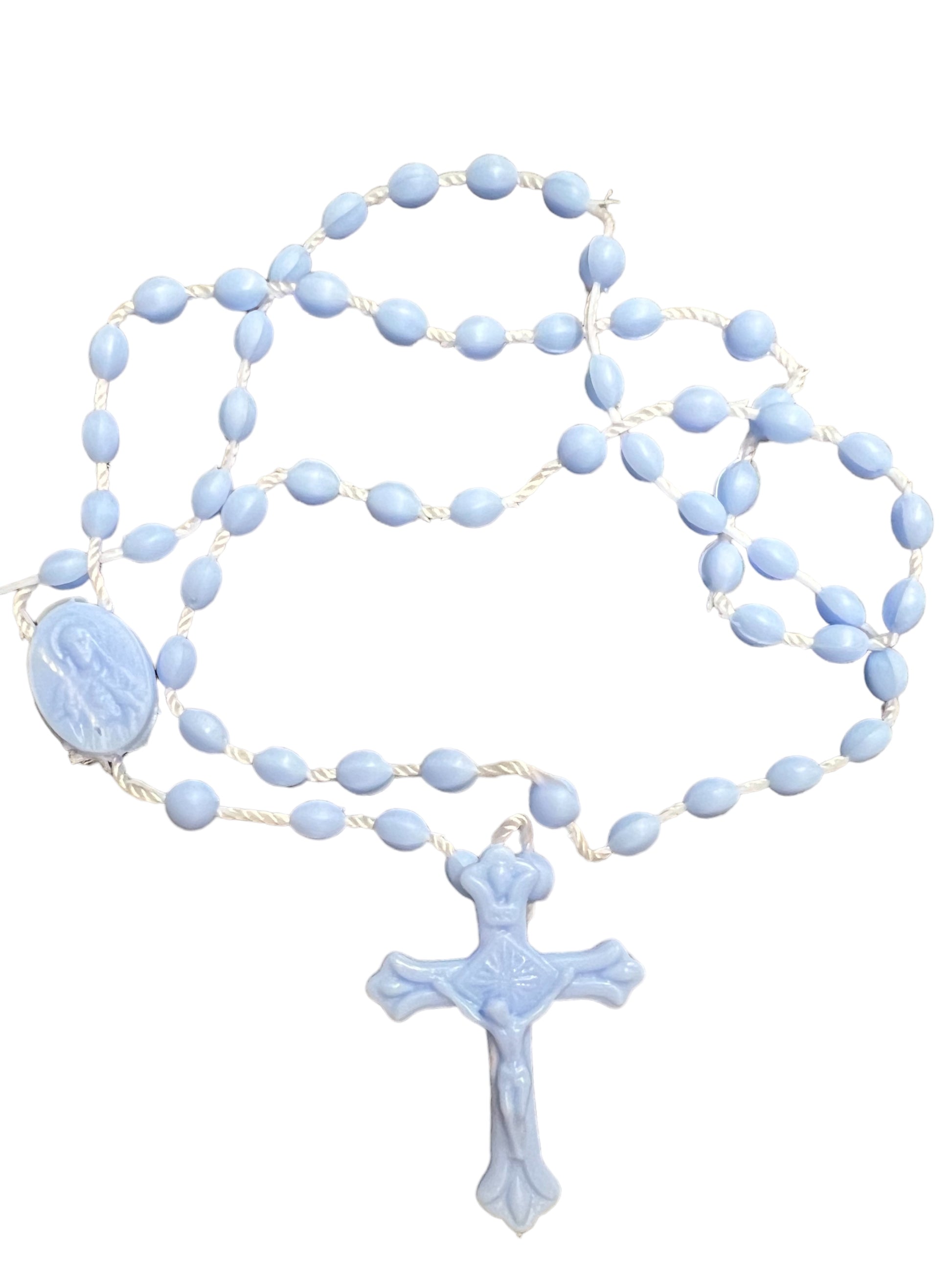 Expertly crafted baby blue plastic rosary featuring 5mm beads on a 16" string. The centerpiece showcases the Sacred Heart of Jesus and Perpetual Help imagery. This elegant devotional piece serves as an ideal memento for Baptism celebrations, offering both spiritual significance and commemorative value.