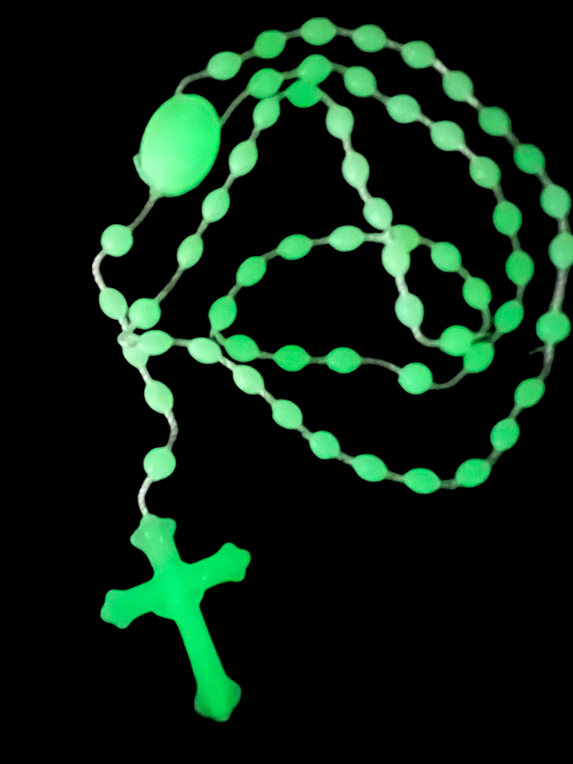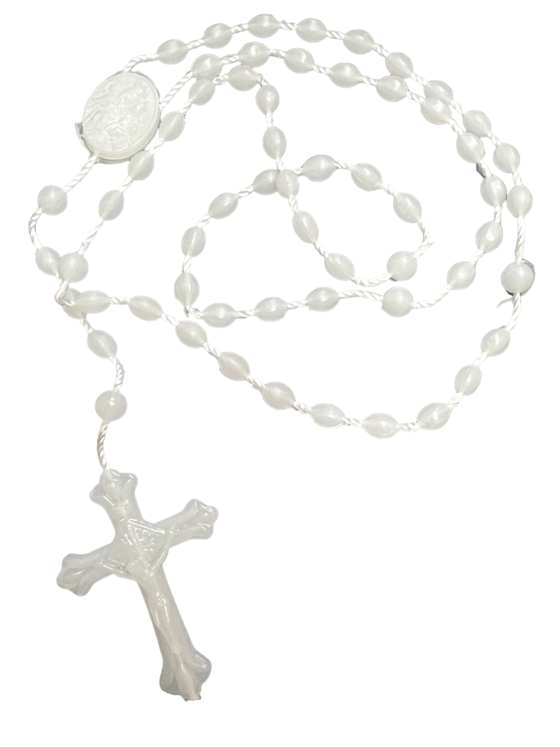 Glow in the dark, luminous Plastic Rosary, string 16", 5mm bead, Sacred Heart of Jesus and Perpetual Help on centerpiece. Glows in the dark. Perfect for Baptismal party favors.