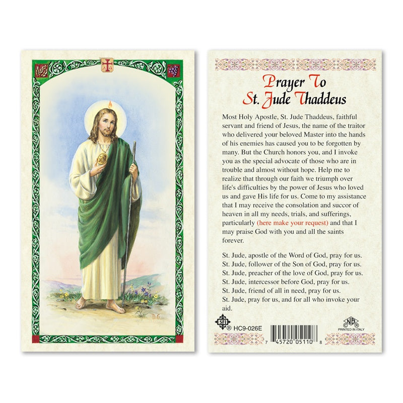 Printed in Italy, prayer card with full color image of St. Jude and traditional prayer on reverse.