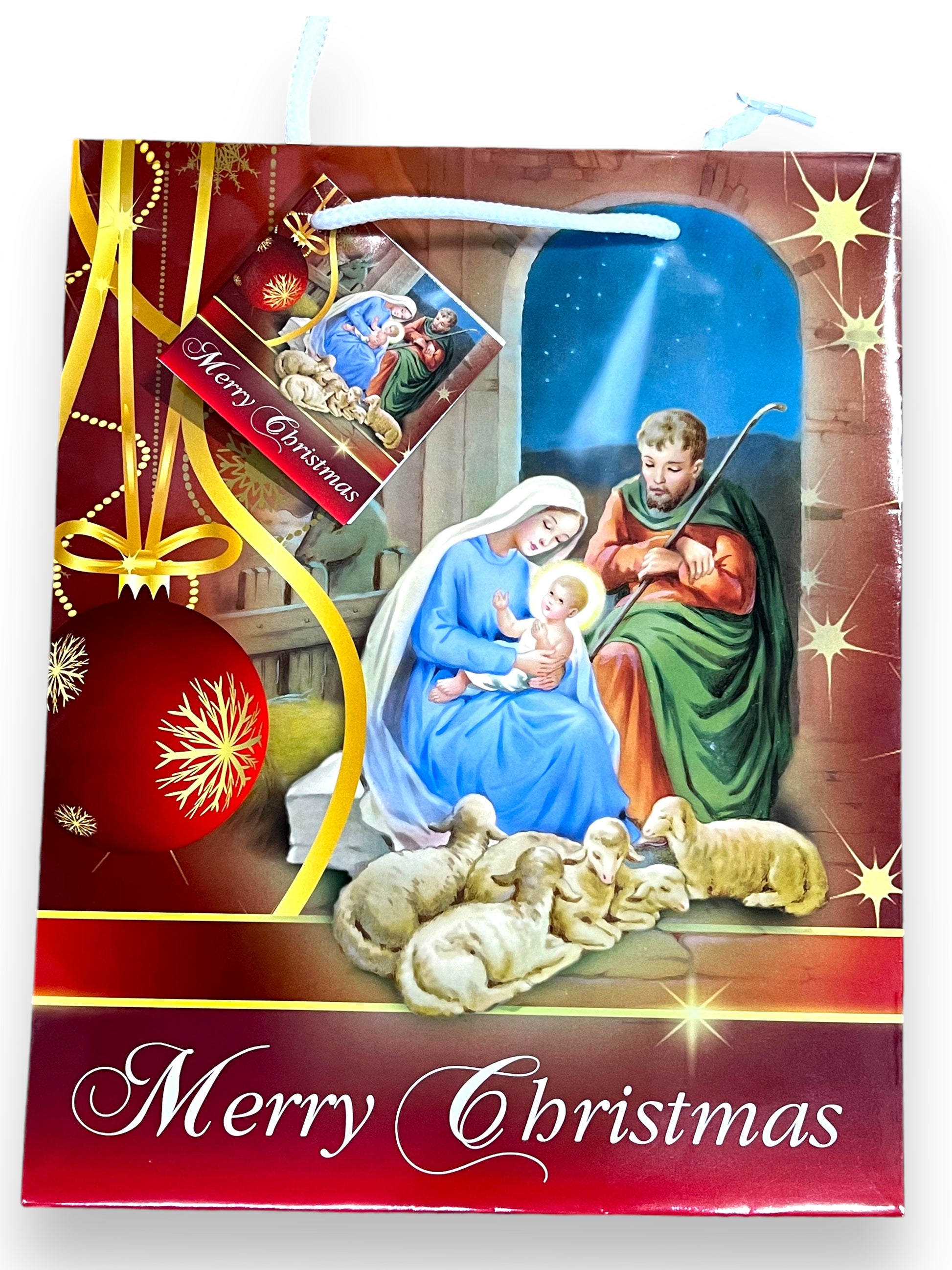 Beautifully designed paper, red Christmas Gift bag with an image of the Nativity of Jesus (Joseph, Mary, and Baby Jesus at a stable). This bag comes with Gift Tissue Paper included and a gift tag attached.