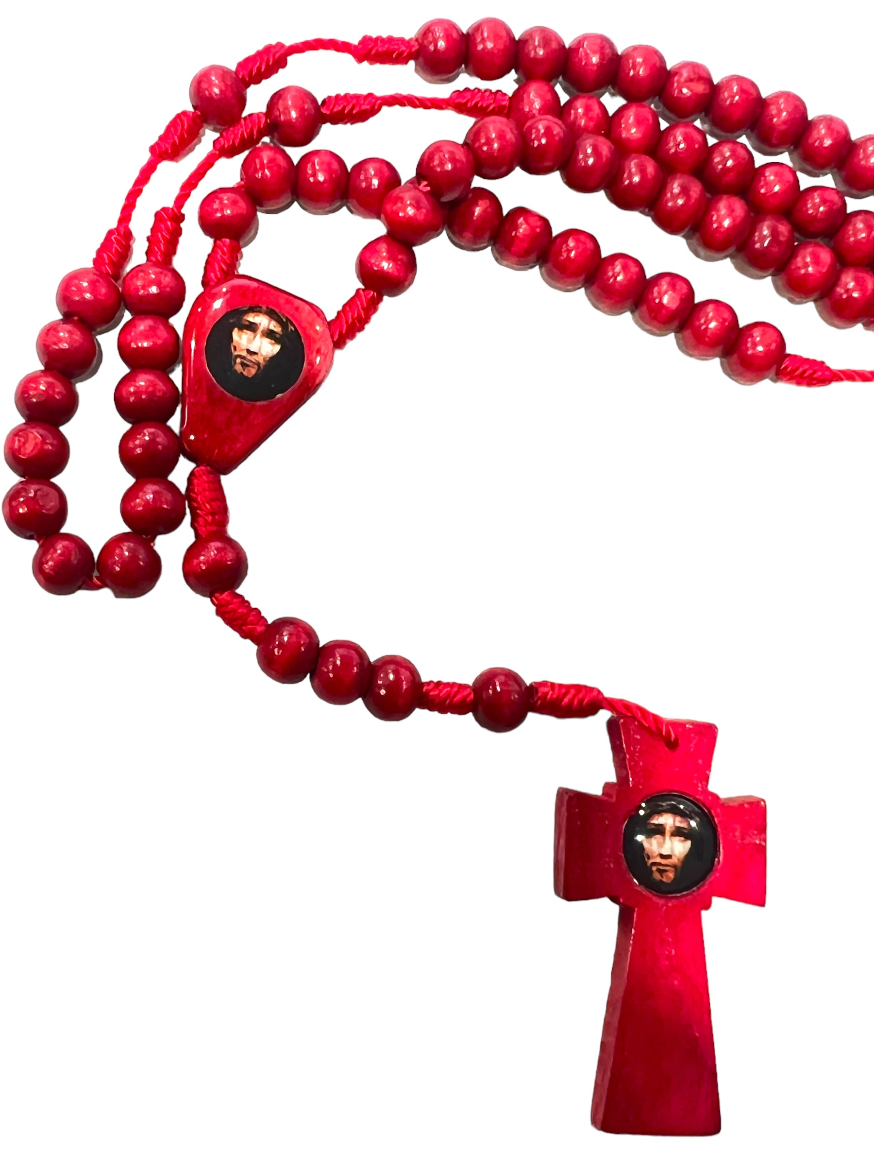 8mm wooden rosary on string with full color image of Precious Blood of our Lord and wooden cross with same image. Made in Mexico.