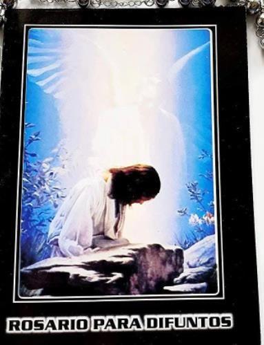 Libro de 16 páginas con el Rosario para Difuntos. Incluye las Letanías. Solamente contiene los Misterios Dolorosos, además de oraciones para difuntos, y oración para el panteón.