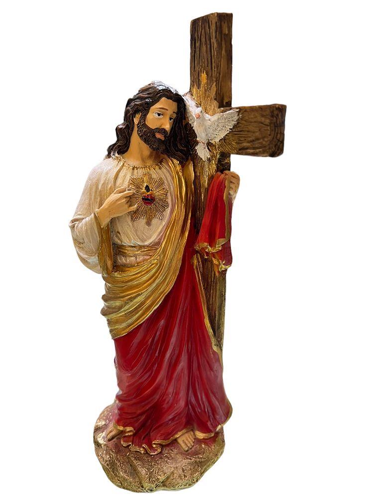 11" Statue of Sacred Heart of Jesus with Cross and Holy Spirit. Hand-painted, with Metallic finish and gold accents. Made of resin in Mexico.