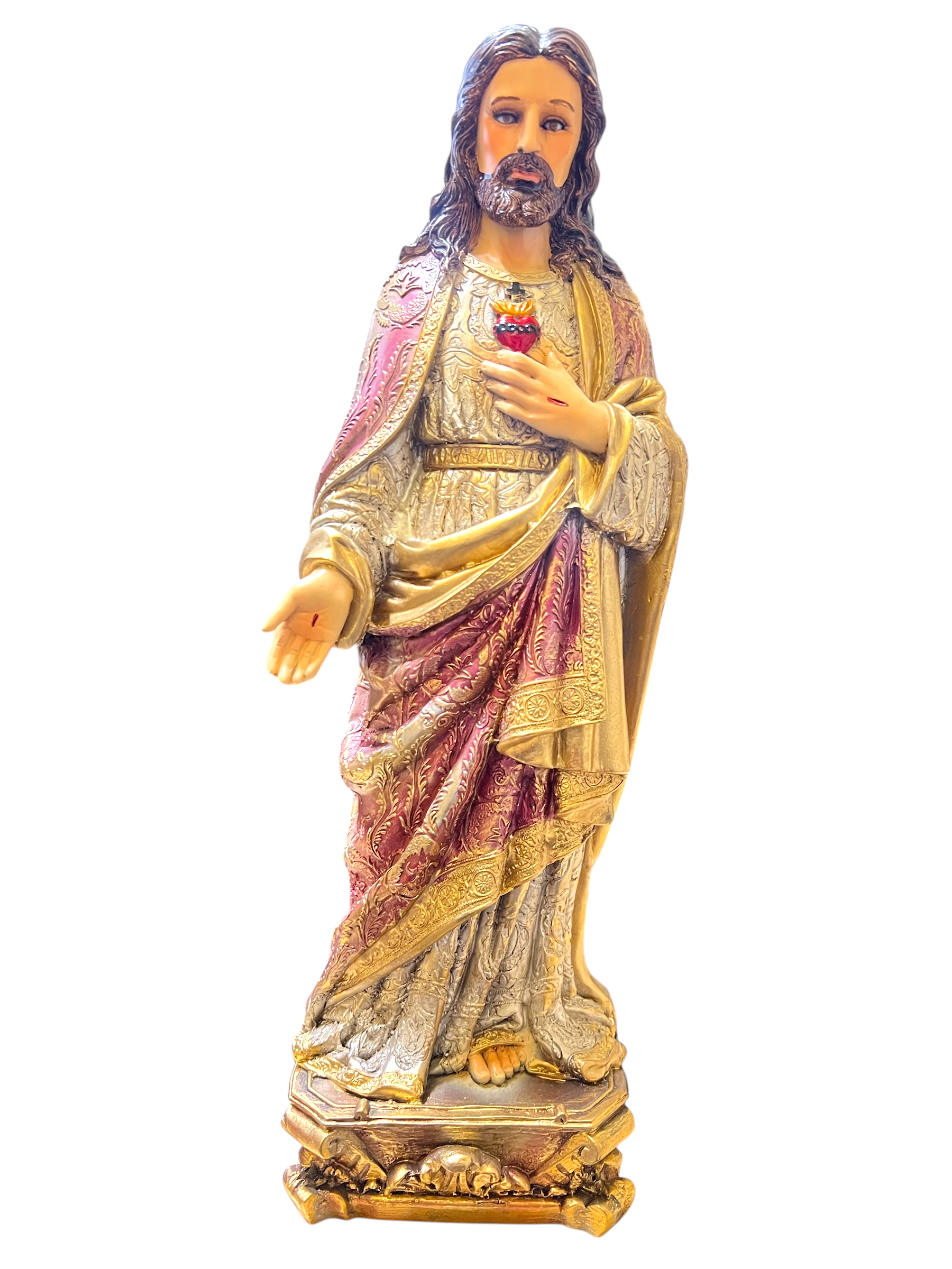24" Statue of Sacred Heart of Jesus. Hand-painted, with Metallic finish and gold accents. Made of resin in Mexico.