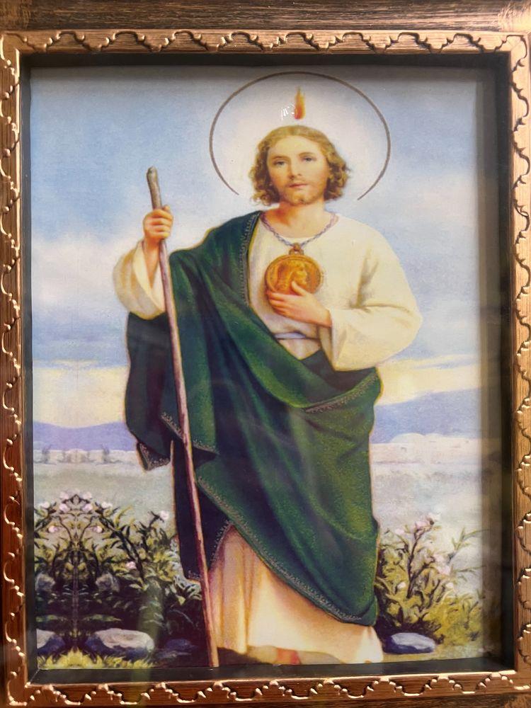 8"x10" Print of St. Jude Thaddeus framed in plastic gold frame. Made in China.