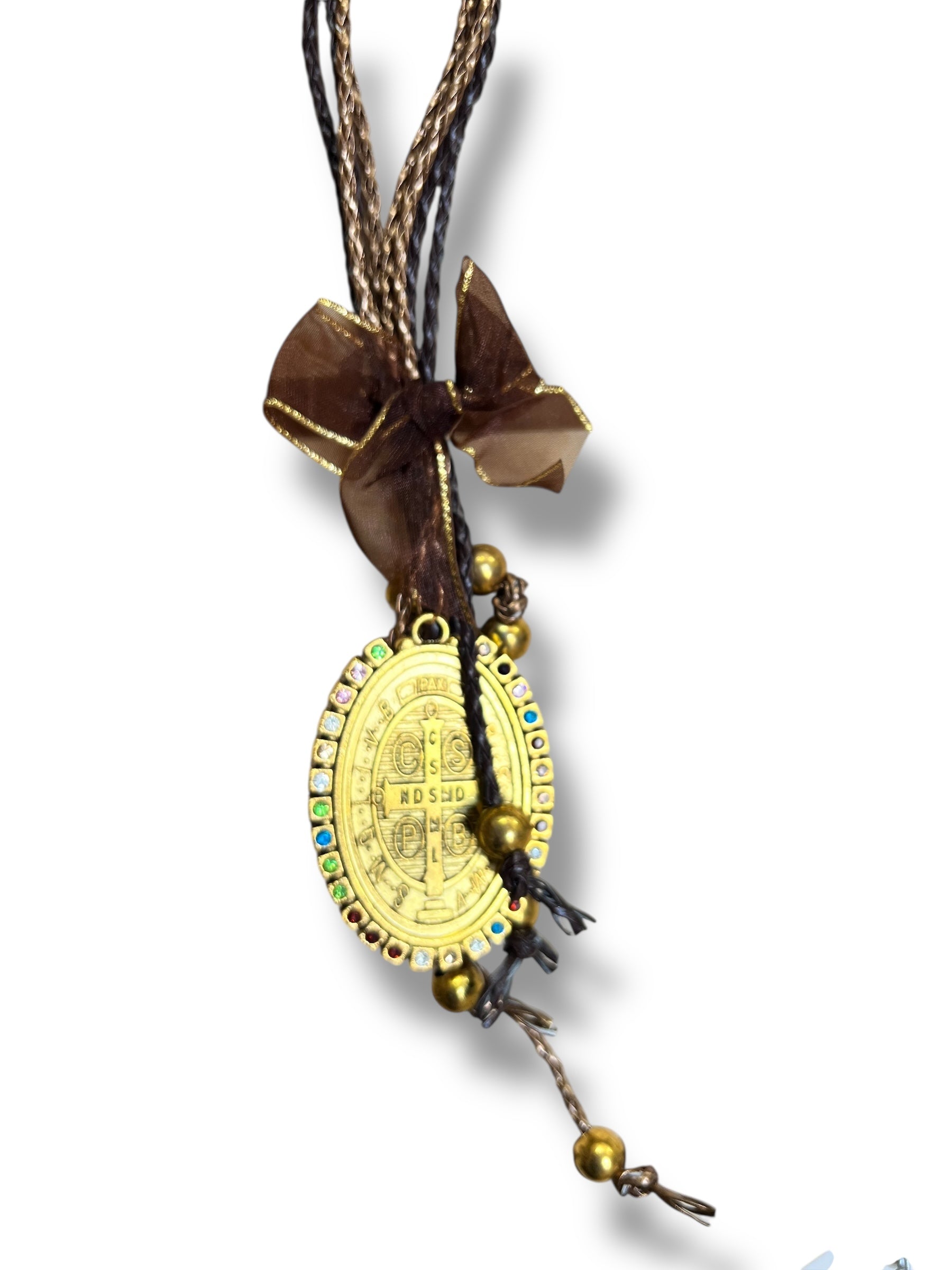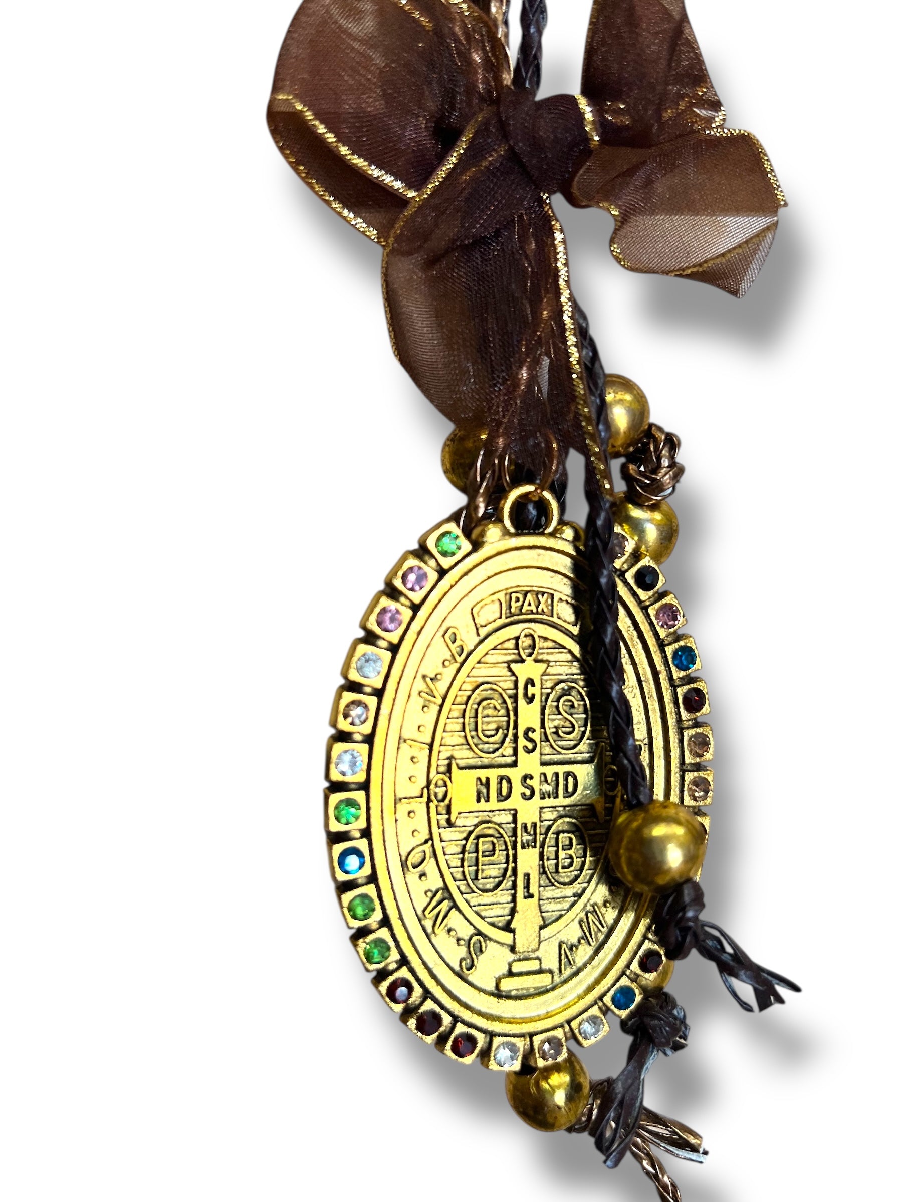 This is a beautiful St. Benedict Home Blessing door-hang. Makes a wonderful house warming present, wedding present, or any occasion. Saint Benedict was a great saint known for his power over evil spirits as it is evident in the medal itself that contains a prayer that is an exorcism. The purpose of using the St. Benedict medal Blessing is to call down God's blessing and protection us. Comes with adorned medal with color crystals and strapped with leather felt cord.