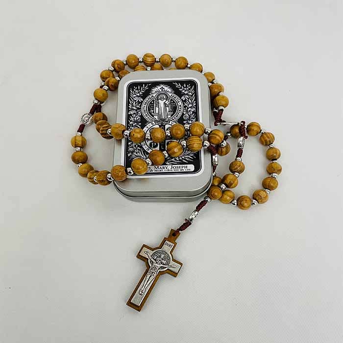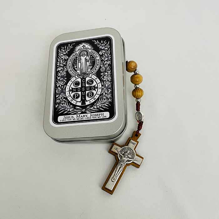 Handcrafted wooden rosary packed in a durable steel tin metal box, with hinges for easy-safe opening and closing, it includes decal with image of St. Benedict Medal on the outside and the significance of medal and prayer to St. Benedict inside.