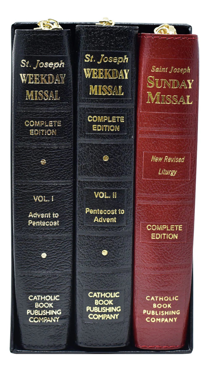 This comprehensive Saint Joseph Daily and Sunday Missal Complete Gift Box 3-Volume Set is all any Catholic will ever need to participate fully in every Mass of the year. This set offers three essential volumes in an attractive and sturdy gold-embossed black imitation leather case, including the Weekday Missal (Vols. I and II) and the complete and permanent one-volume Sunday Missal (Cycles A, B, and C). Easy to use because each book follows the liturgical year, the two-volume perpetual Weekday Missal contains all Weekday Masses, with Volume I including the Masses from Advent to Pentecost and Volume II covering those from Pentecost to Advent. The third volume in this set is the Saint Joseph Sunday Missal, an all-inclusive Missal that provides the Lectionary readings and celebrant's and people's prayers (in boldface type) for Sundays, Vigils, and Holydays. With sewn bindings for durability, all three volumes are covered in rich bonded leather with convenient zipper closures. This beautifully packaged Saint Joseph Daily and Sunday Missal Complete Gift Box 3-Volume Set is an invaluable, all-encompassing resource for priests, religious, and laity.