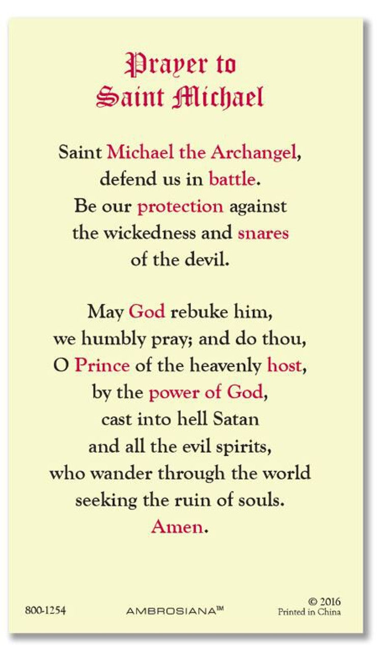 Saint Michael the Archangel, defend us in battle. Be our protection against the wickedness and snares of the devil. May God rebuke him, we humbly pray; and do thou, O Prince of the heavenly host, by the power of God, cast into hell Satan and all the evil spirits, who wander through the world seeking the ruin of souls. Amen.