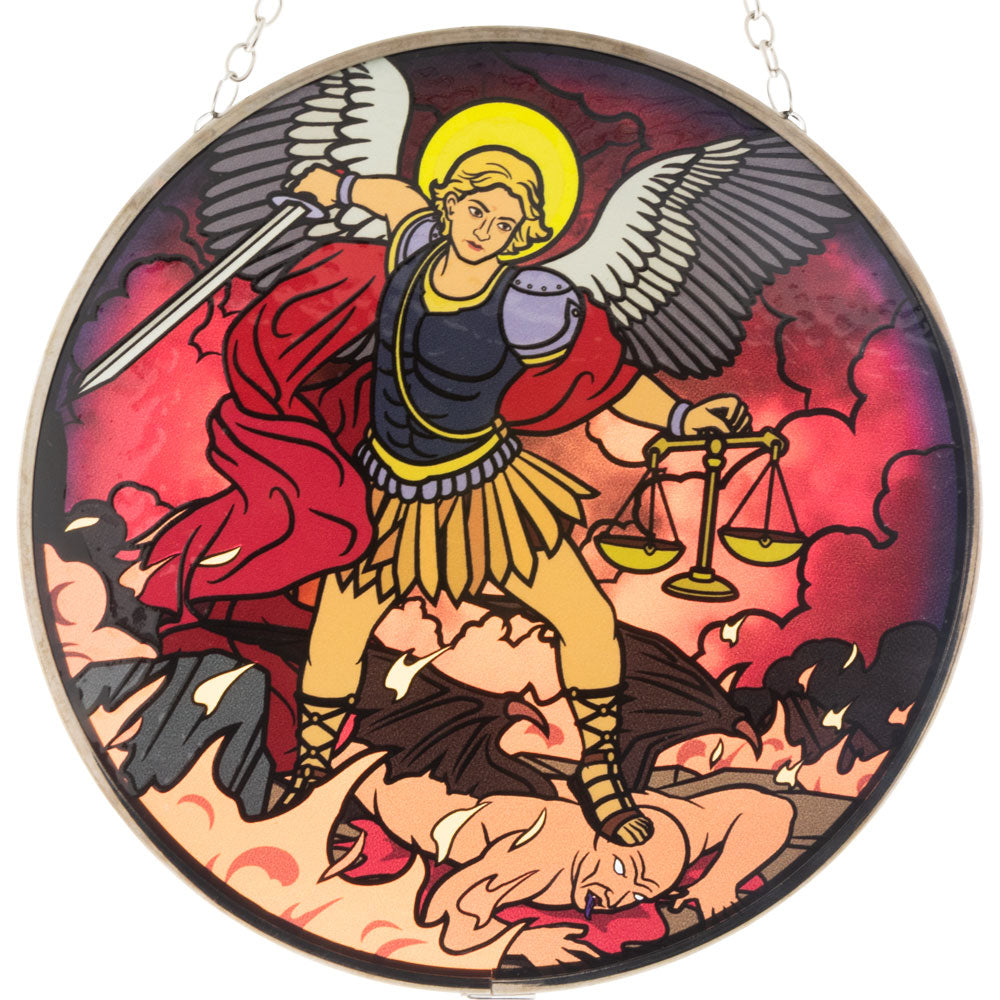 Vitrial de 6" de diámetro de San Miguel Arcángel, con colores vibrantes. Viene con gancho de succión para colgar en el vidrio de la ventana y admirar los rayos de sol irradiar. Hecho en China.