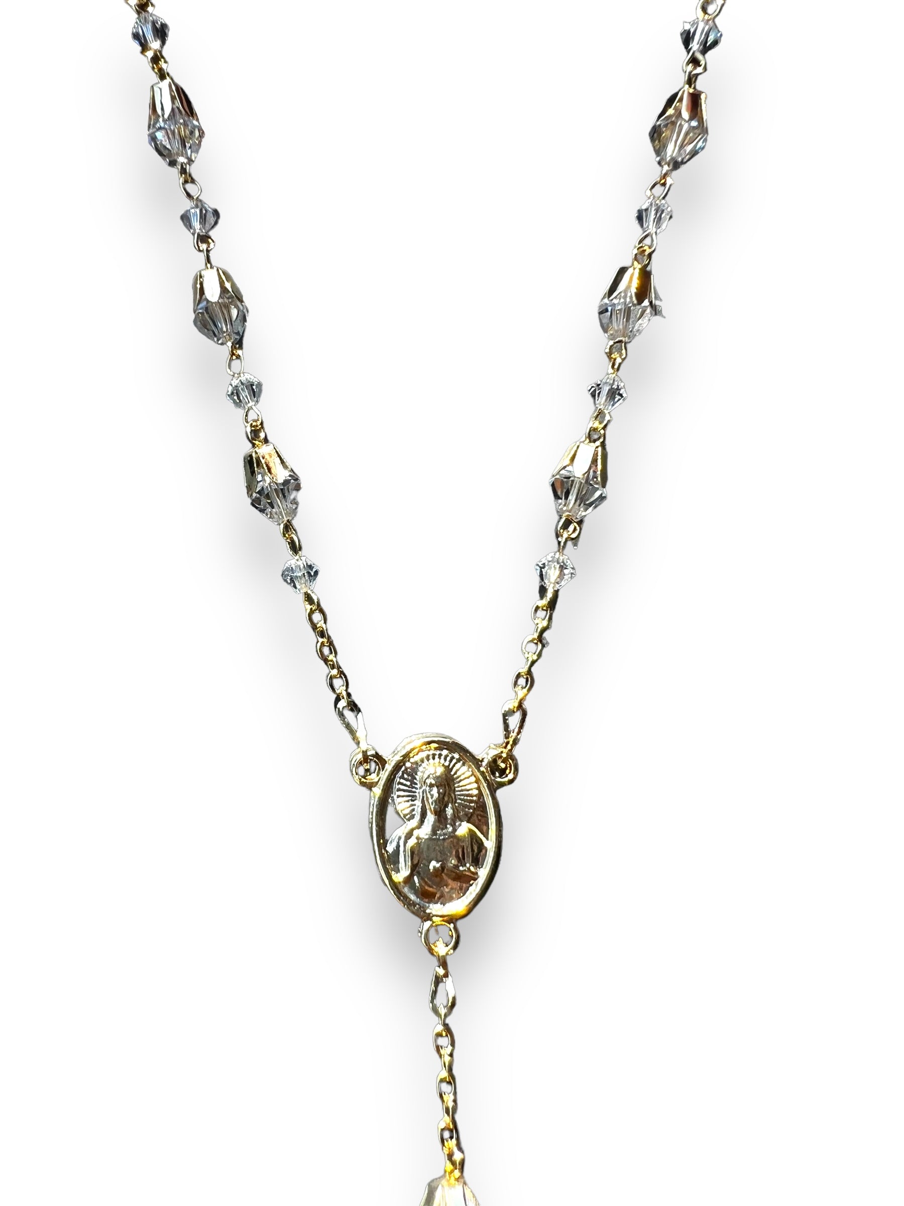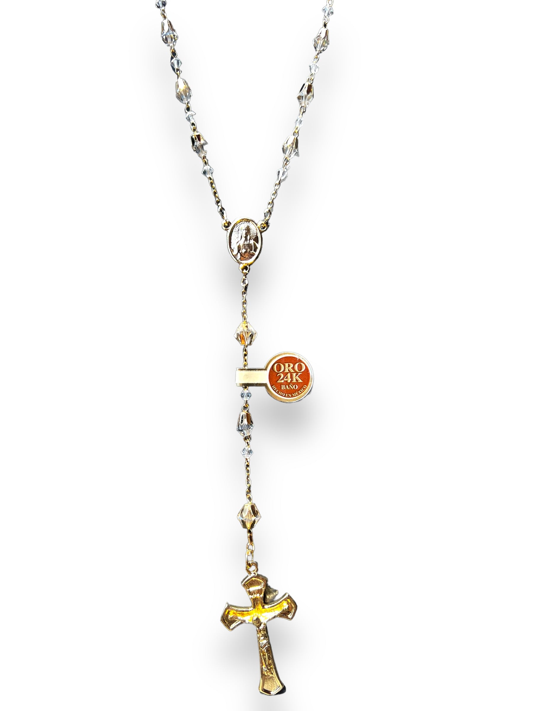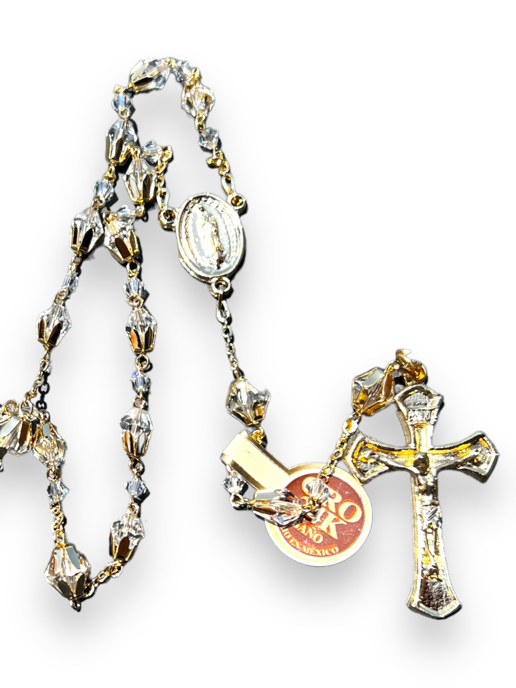 Rosario de cristal cortado en cadena italiana. Cuenta mide 6mm, con casquillo y forma de lágrima. Crucero muestra Virgen de Guadalupe/Sagrado Corazón de Jesús.